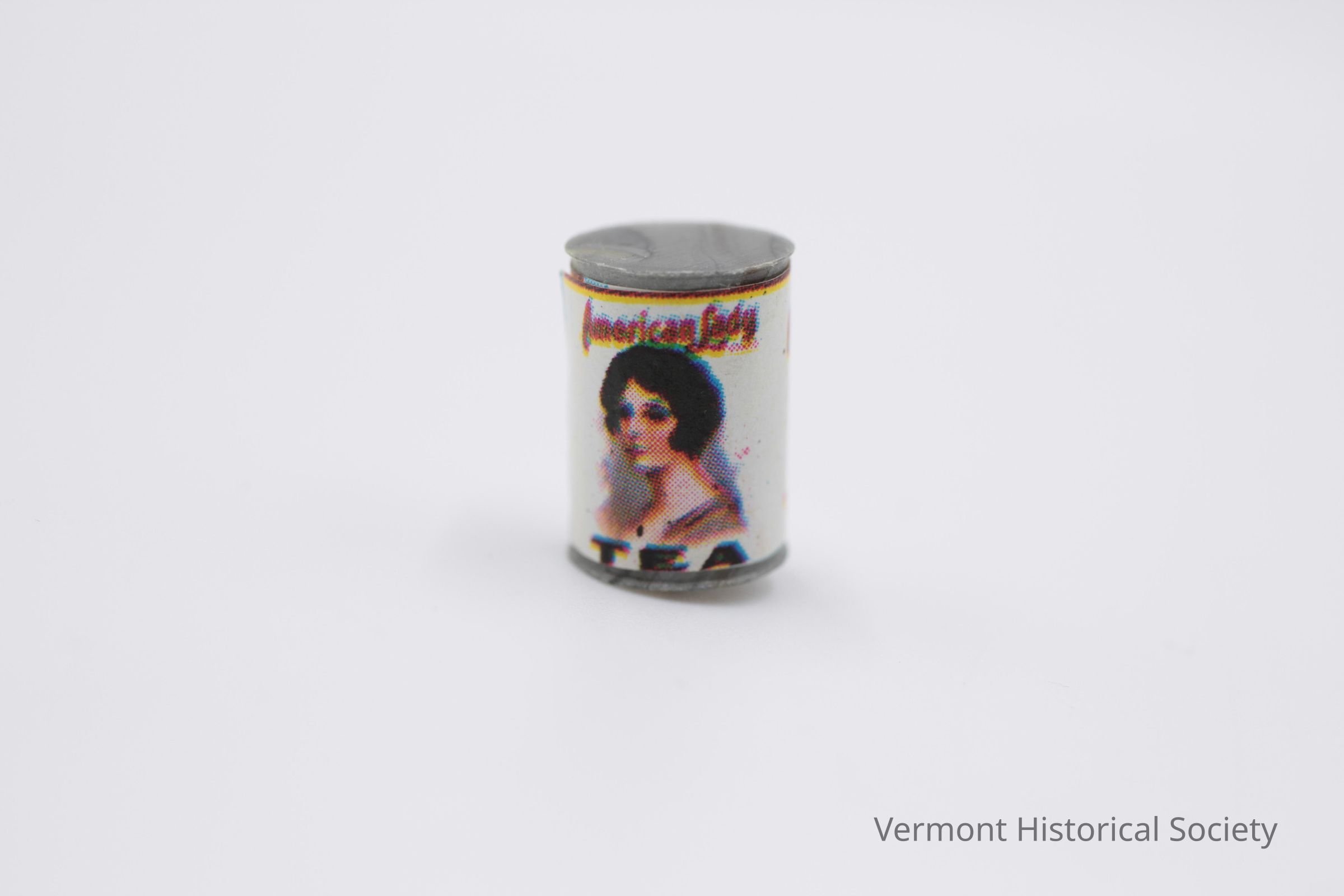 Miniature cylindrical food-storage can. The can is made of silver-colored plastic and is wrapped with a printed paper label. One side of the paper label shows a young woman and the words, "American Lady TEA". The other side shows a military medal and the words, "American Lady."Context