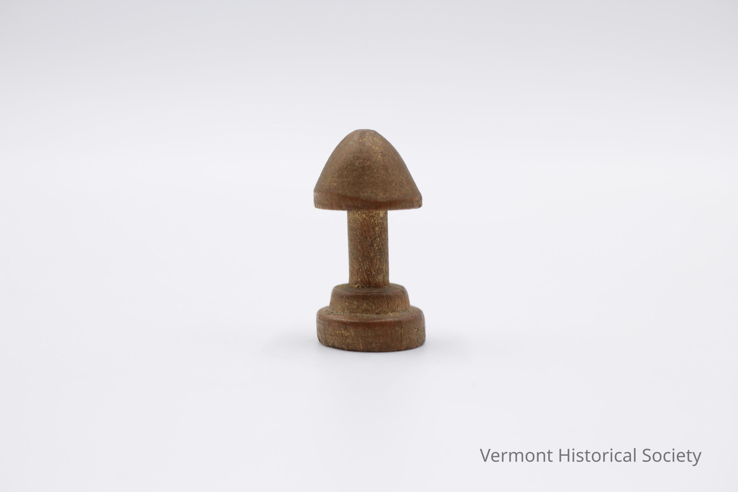 Miniature wooden table lamp sized for a dollhouse. The lamp is one single piece consisting of a base, shaft, and shade.Context