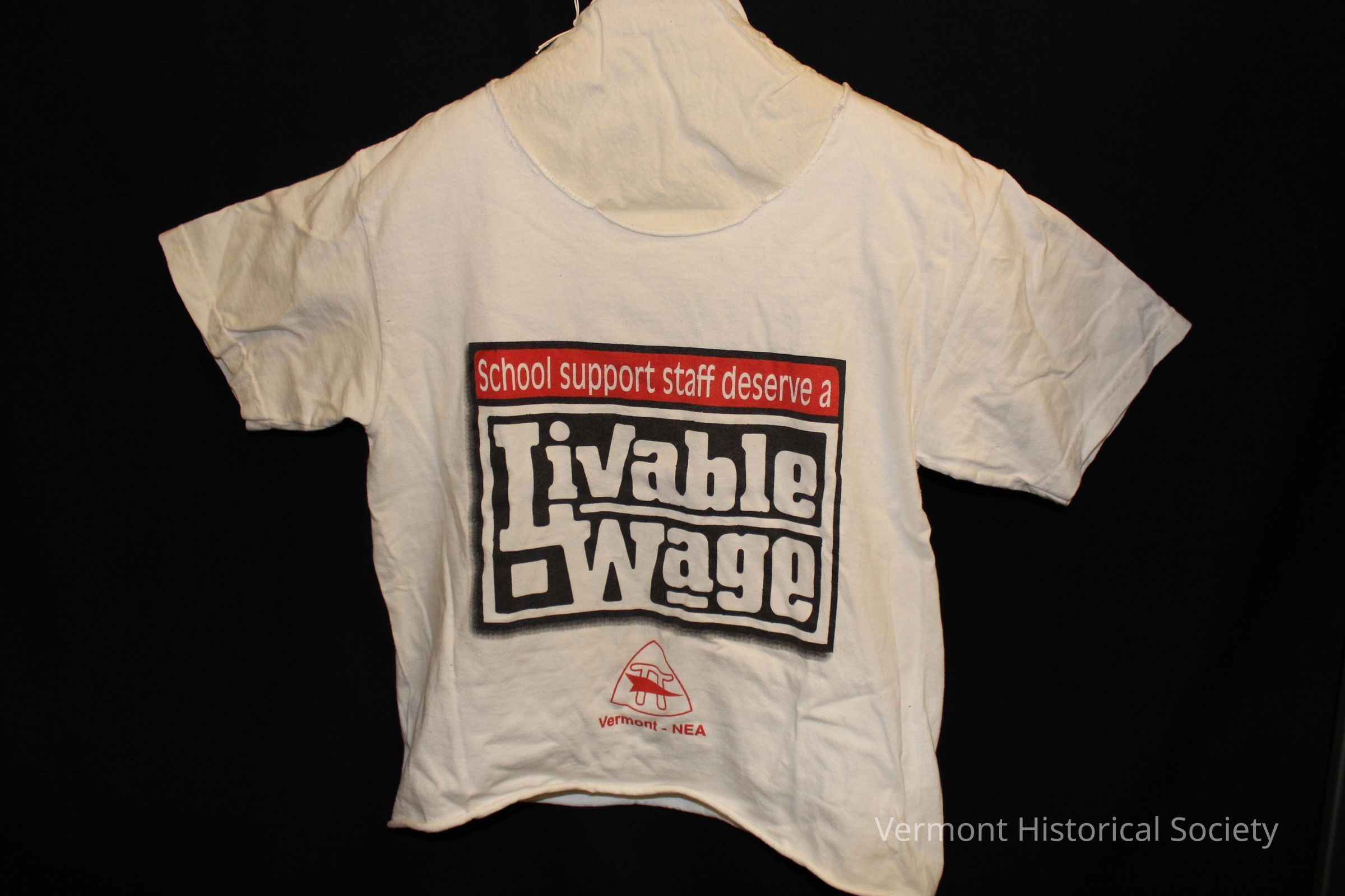 White t-shirt printed on the front with the words, "School support staff deserve a" within a red rectangle above a black rectangle with the white words, "Livable Wage". Beneath that is a red logo consisting of a pi symbol within a triangle and the words, "Vermont - NEA". The neck binding and the hem have been cut off.
