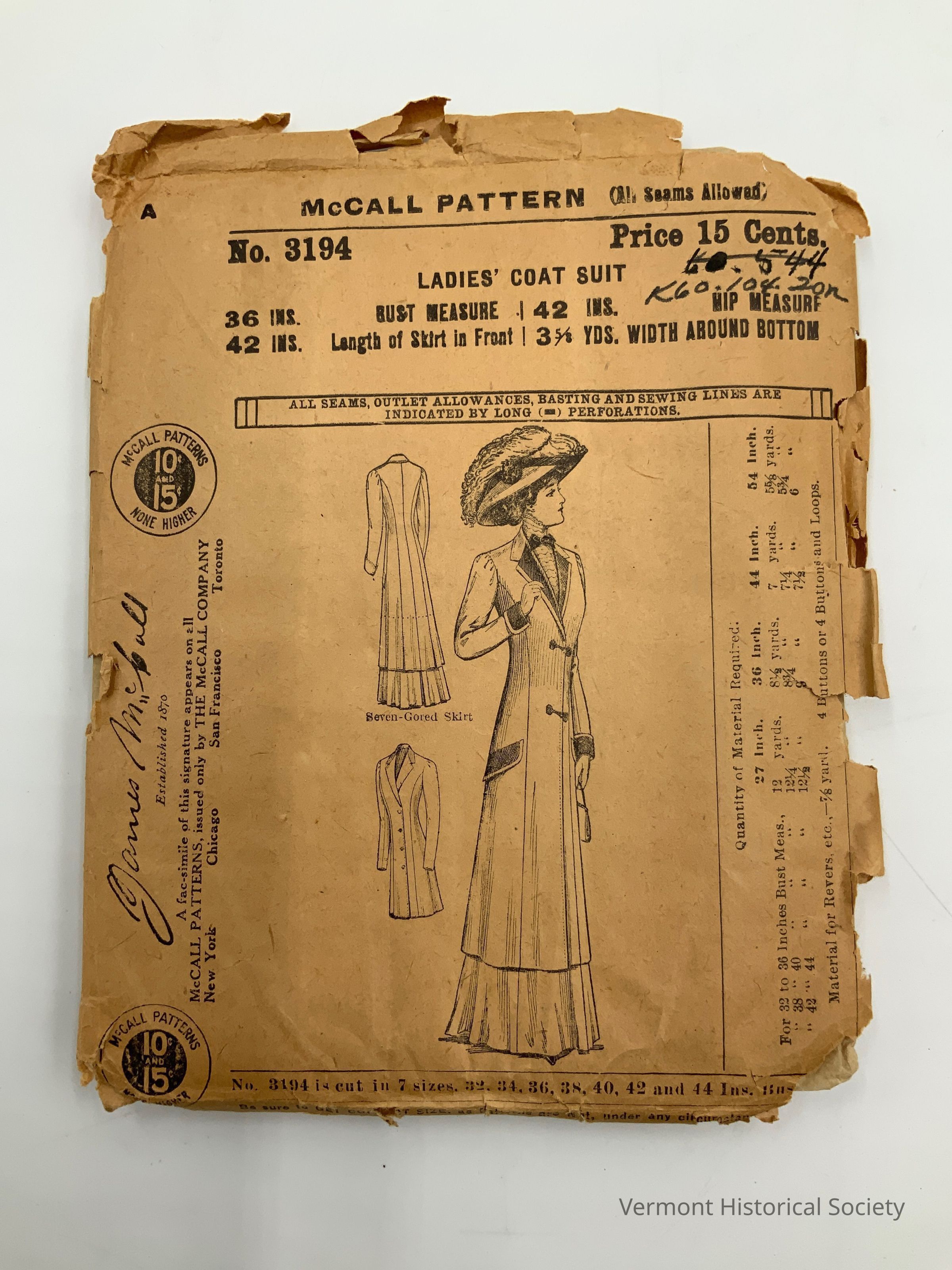 Cut tissue paper sewing pattern in a commercial envelope. The front of the envelope is printed with brand information ("McCALL PATTERN"), sewing instructions, and an illustration of the finished garment. The garment is a suit consisting of a long, shin-length coat and a gored skirt ("Ladies' Coat Suit").Context