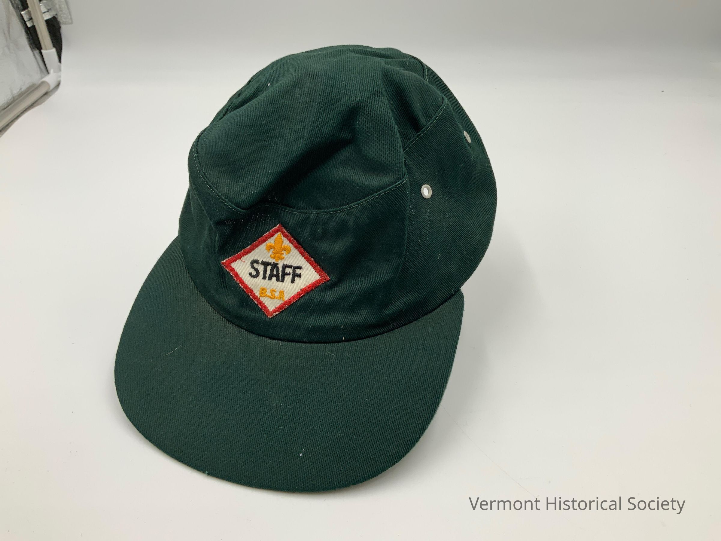 Green baseball cap. Positioned at the center front of the cap is a diamond-shaped patch that bears the inscription "STAFF B.S.A." Below this text, a fleur-de-lys, a stylized lily symbol, adds a touch of elegance to the design.
