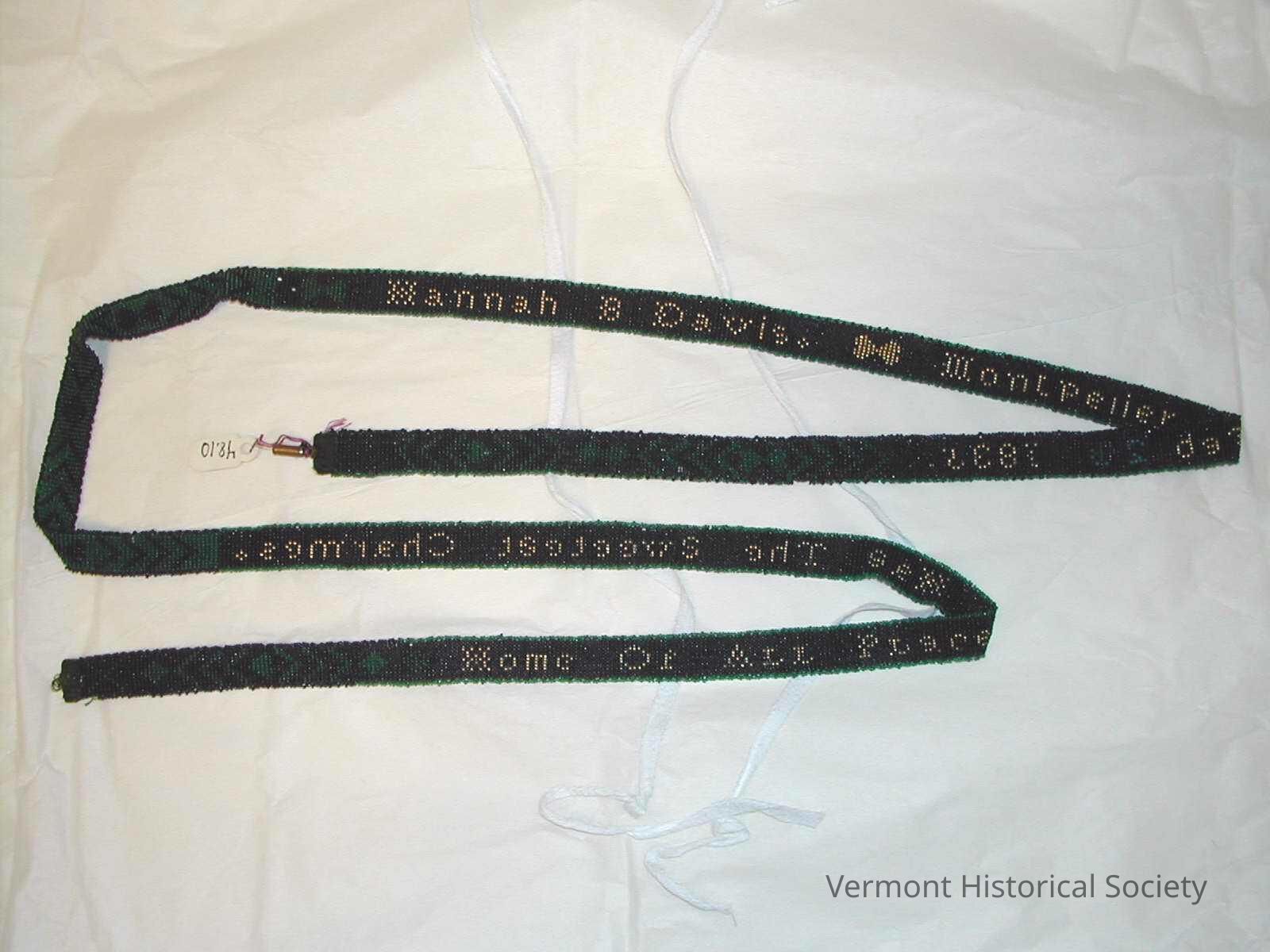 Loom-woven bead chain in blue and gold with the inscription, "Home of all places has the sweetest charmes. Hannah B. Davis, Montpelier, Feb. 24, 1835." There is a double heart after "Davis".Context