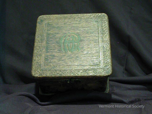 Small carved wooden box. The sides are carved with art nouveau daffodils over a roughly carved and burned ground. The center of the lid has a carved and painted green monogram of the initials HGR. The inside is decoratively burned into a basket weave patter.