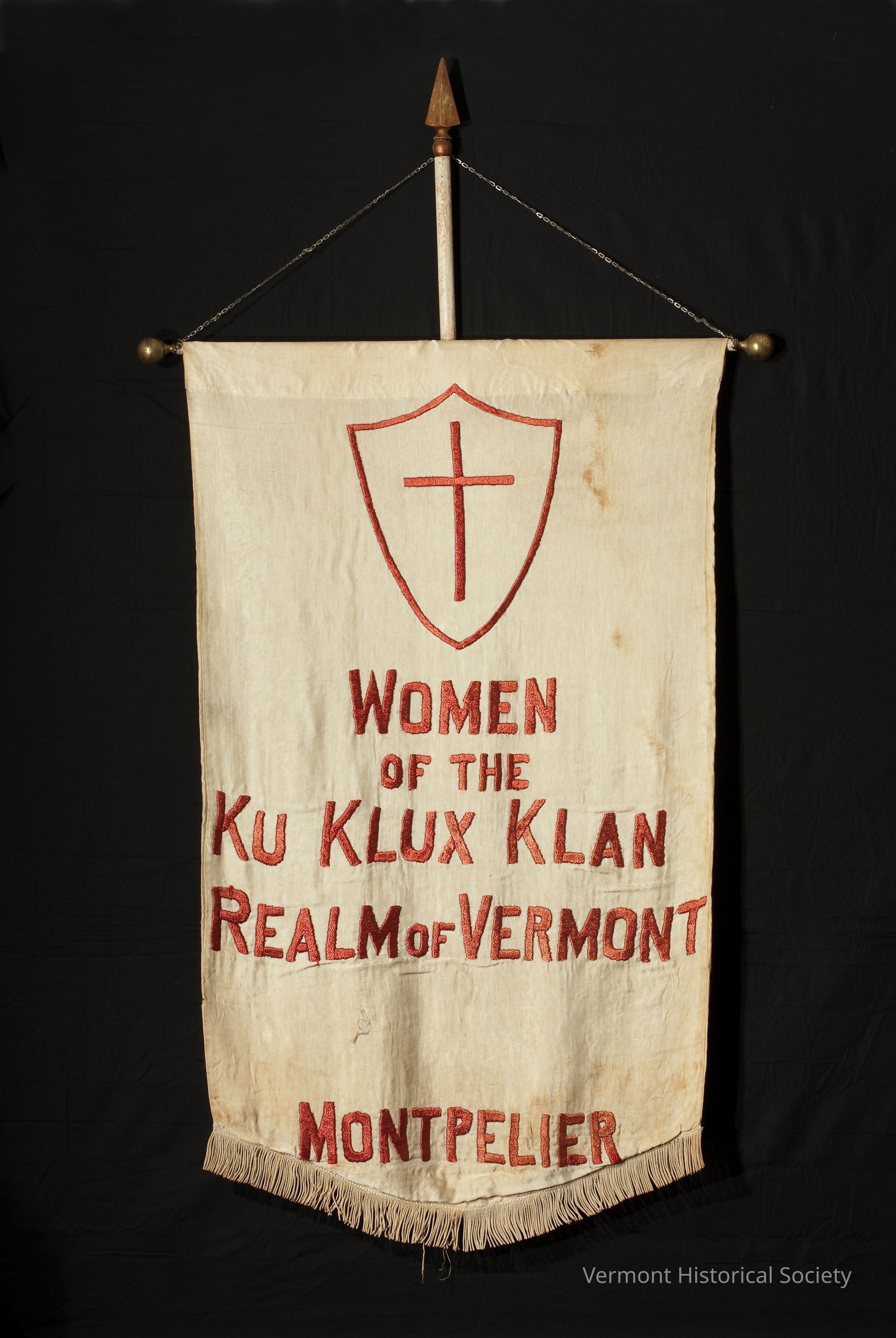 White banner embroidered with red thread with the inscription, "WOMEN OF THE KU KLUX KLAN REALM OF VERMONT / MONTPELIER" beneath an image of a cross within a shield. The bottom of the banner is curved and edged with fringe. The top of the banner is stitched into a casing, into which is inserted a painted dowel. A flat link chain is attached to either end of the dowel, next to the brass ball. To the center of the chain is attached the vertical hollow dowel with a wooden spear like tip.Context