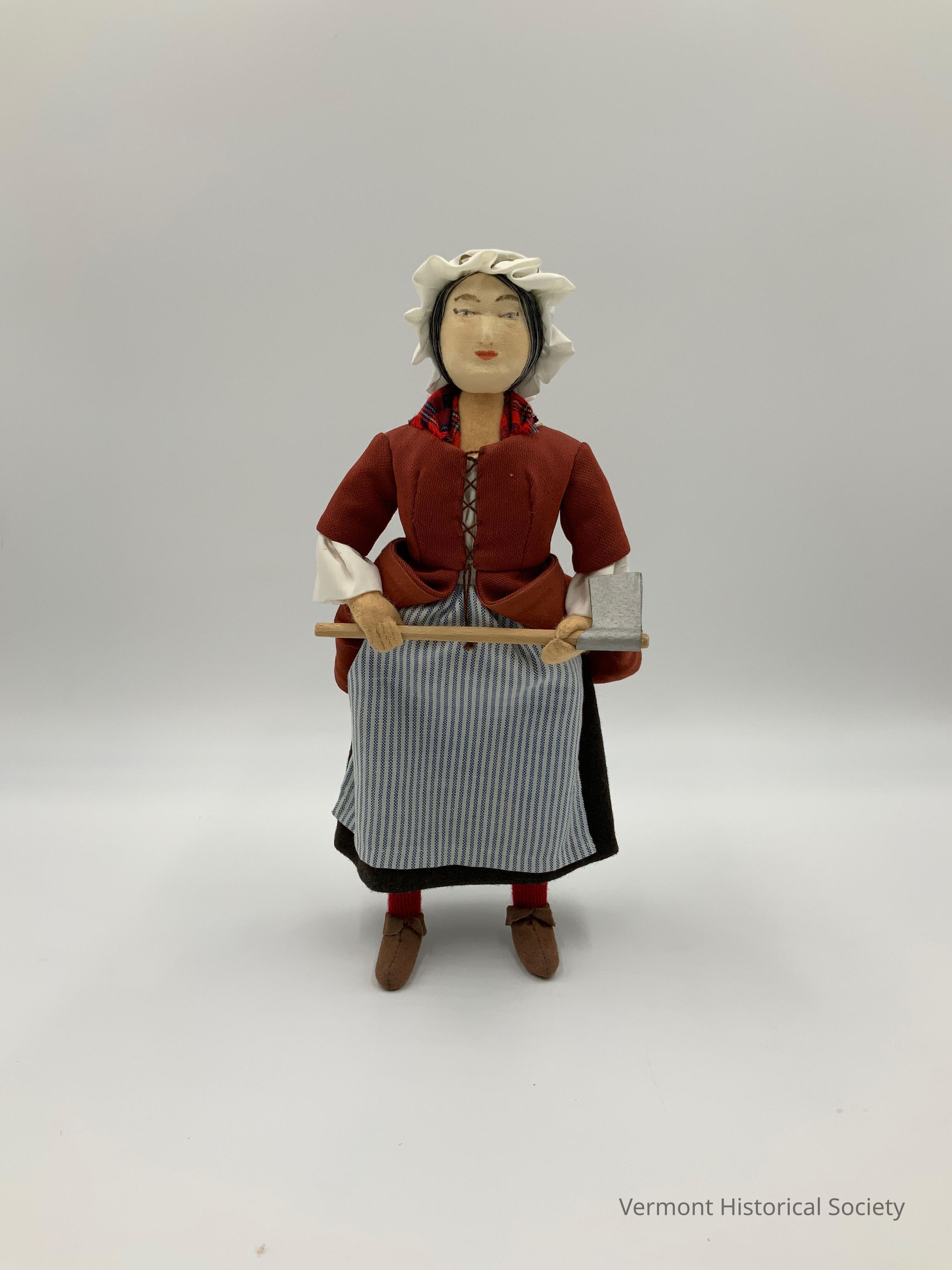 Soft-bodied "Ann Story" doll. The doll is wearing 18th-century-style clothing consisting of a red gown, grey petticoat, blue-and-white striped apron, red stockings, brown shoes, white shift, red-and-black neckerchief, and white cap. She is holding an ax in both hands. The doll stands via an internal wire armature, which protrudes from the back of each food, acting as a balance for the doll to stand upright.