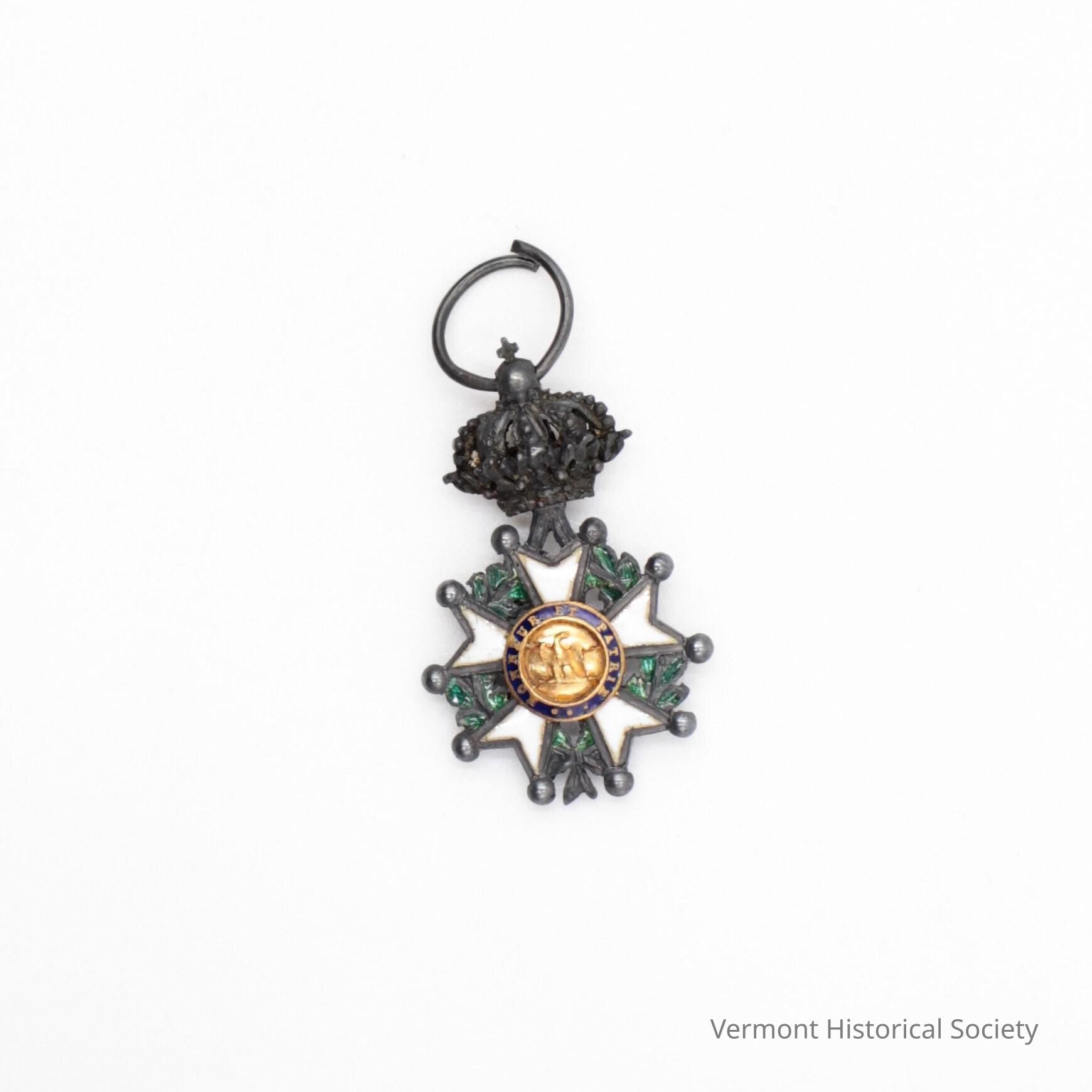 Legion of Honor medal hanging from an eye ring. The top portion is made of silver and in the shape of an elaborate royal crown. The lower part is enameled with white and green with a gold center and the words "HONEUR ET PATRIE" on one side and "NAPOLEON EMP DES FRANC".