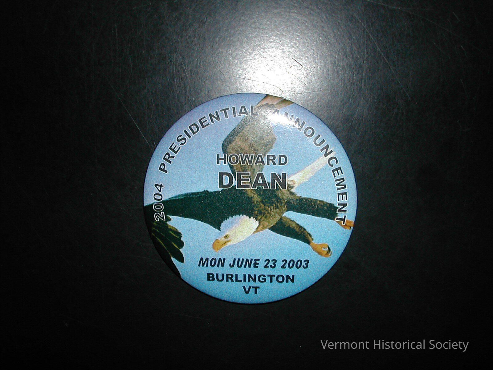 A button from Howard Dean's campaign for president in 2004. Dean, a Democrat, was governor of Vermont from 1991 to 2002. From the Encyclopedia Britannica, "Dean began his political career in 1982 as a state representative in the Vermont House of Representatives. He was then elected lieutenant governor in 1986. Dean became Vermont’s governor on August 14, 1991, after the death of Gov. Richard Snelling."