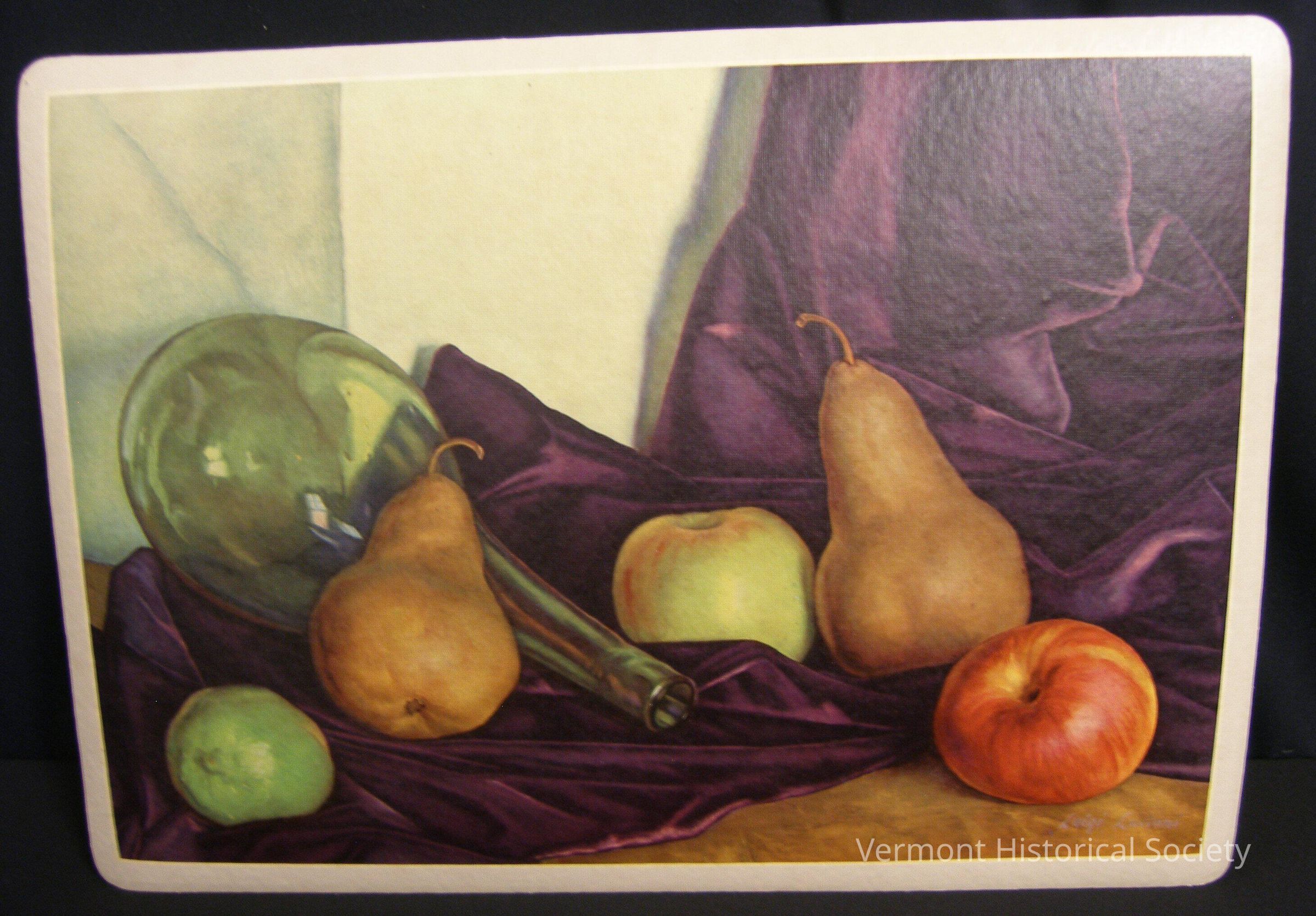 This is a placemat featuring a still life artwork by Luigi Lucioni titled "Wine Bottle". The image depicts a green wine bottle and five pieces of fruit on a deep purple fabric. The back of the placemat is made of cork and there is a paper label in the lower left corner. It is part of a set of four and comes in a cardboard box.