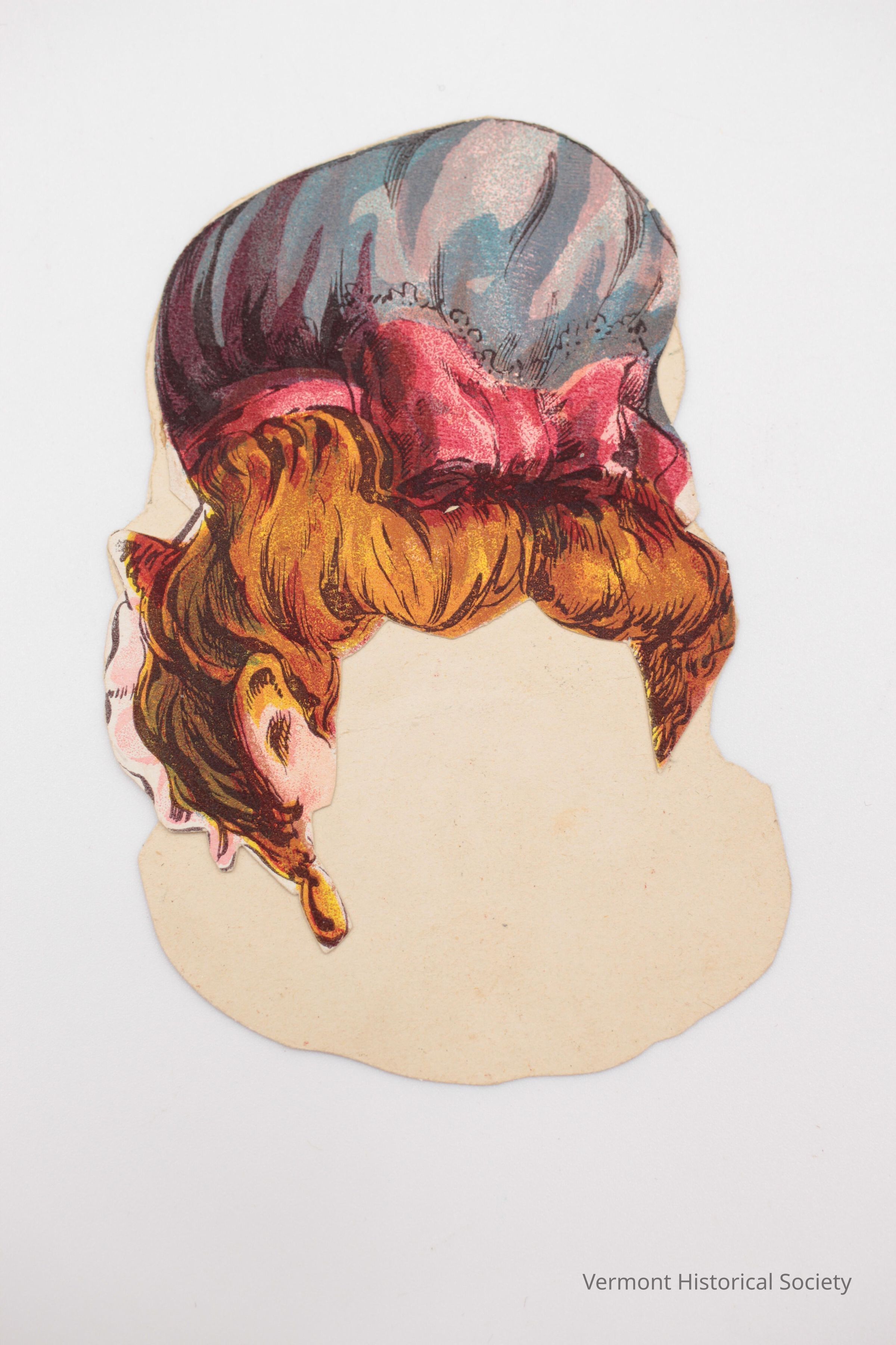 Two-sided wig for a paper doll. This wig has upswept red-blonde hair with a tall mobcap style hat on the top. The crown of the hat is purple, and the base is wrapped in a pink ribbon. The reverse shows the same wig from the back.