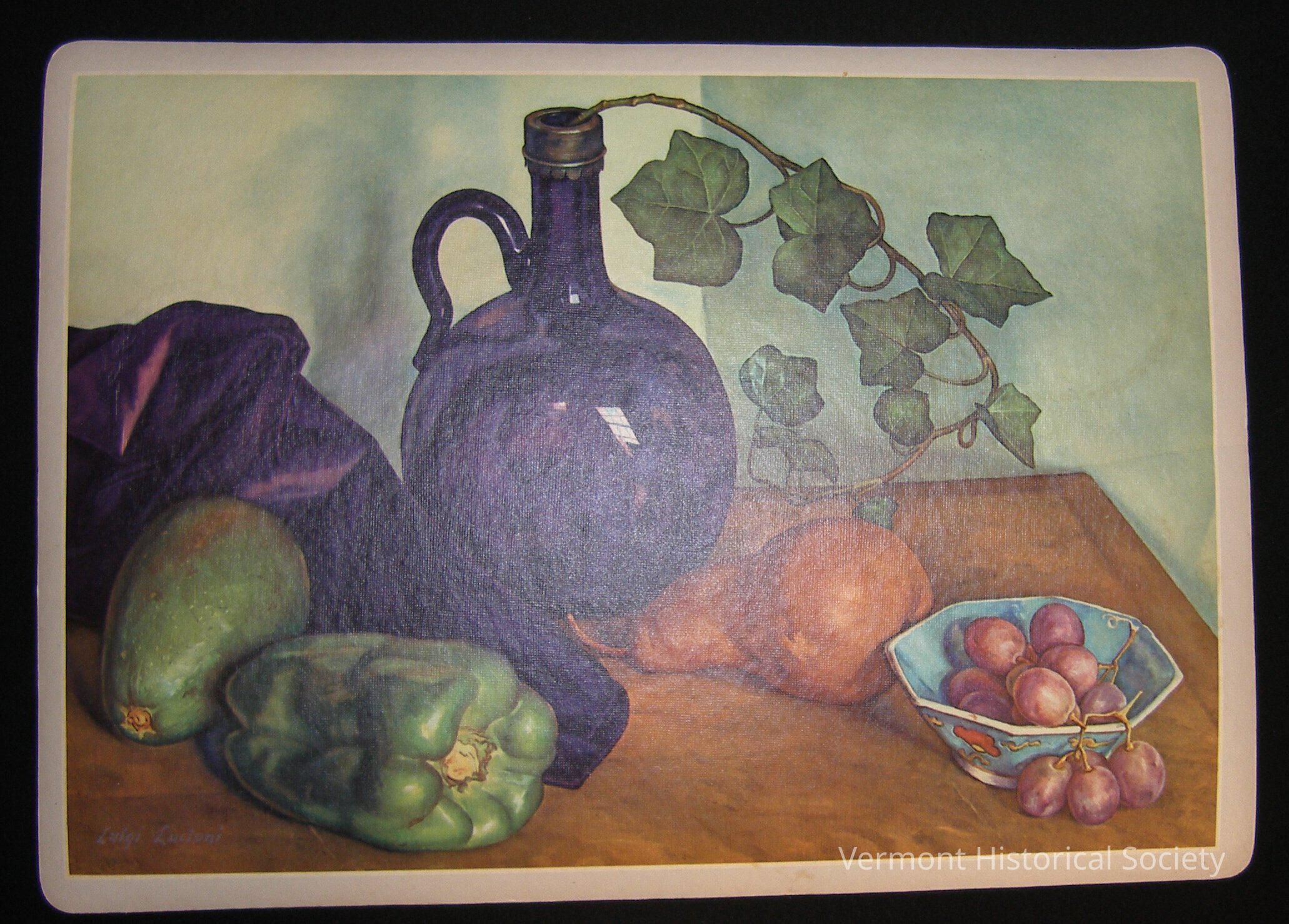 Still life placemat featuring artwork by Luigi Lucioni titled, "Fruit on Velvet." The placemat depicts a deep purple wine bottle with ivy, a small bowl of grapes, a pear, a green pepper, and another piece of fruit resting on deep purple velvet. The back of the placemat is made of cork, and there is a paper label attached to the lower left corner of the back. The placemat is part of a set of four and comes in a cardboard box.