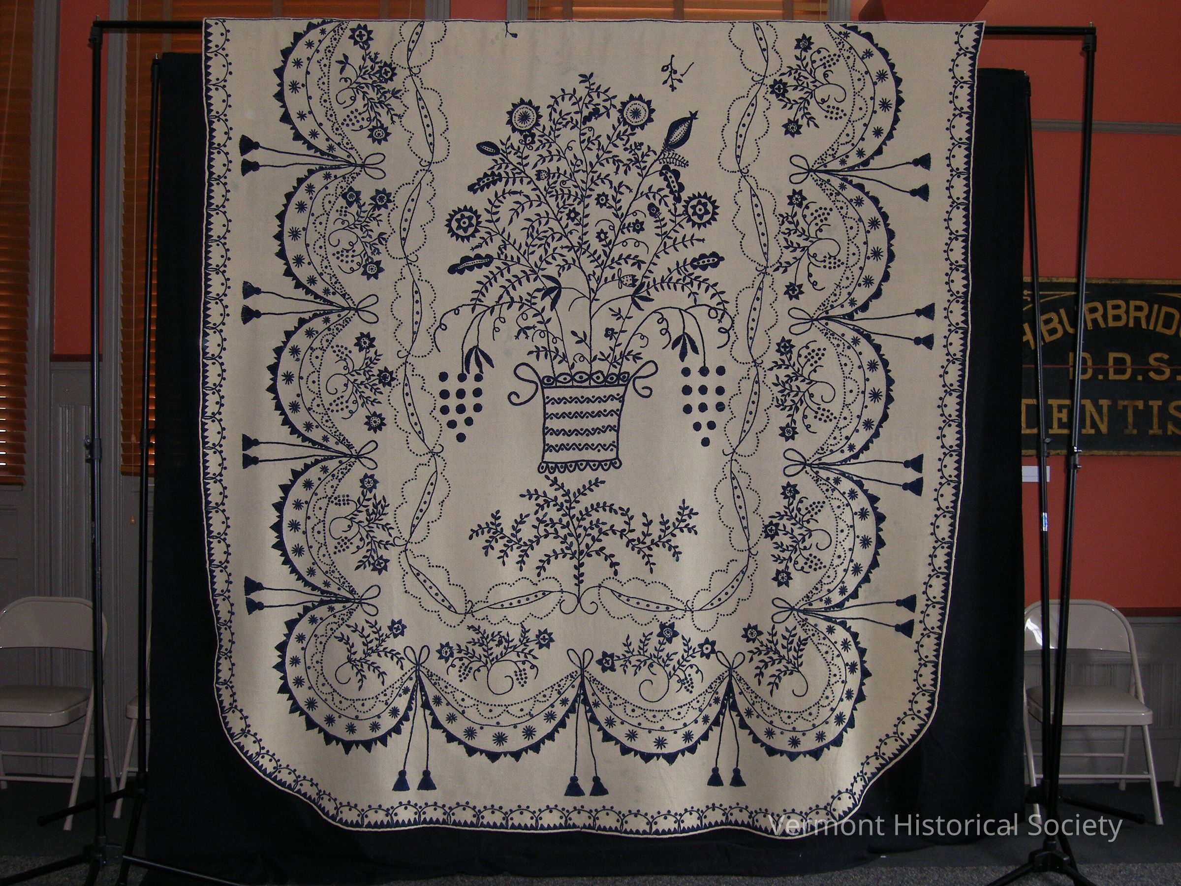 Undyed twill-woven counterpane embroidered in blue with a design of a large central floral bouquet in a pot and border of swags, flowers, and tassels. The bottom corners are curved, and there is no fringe.