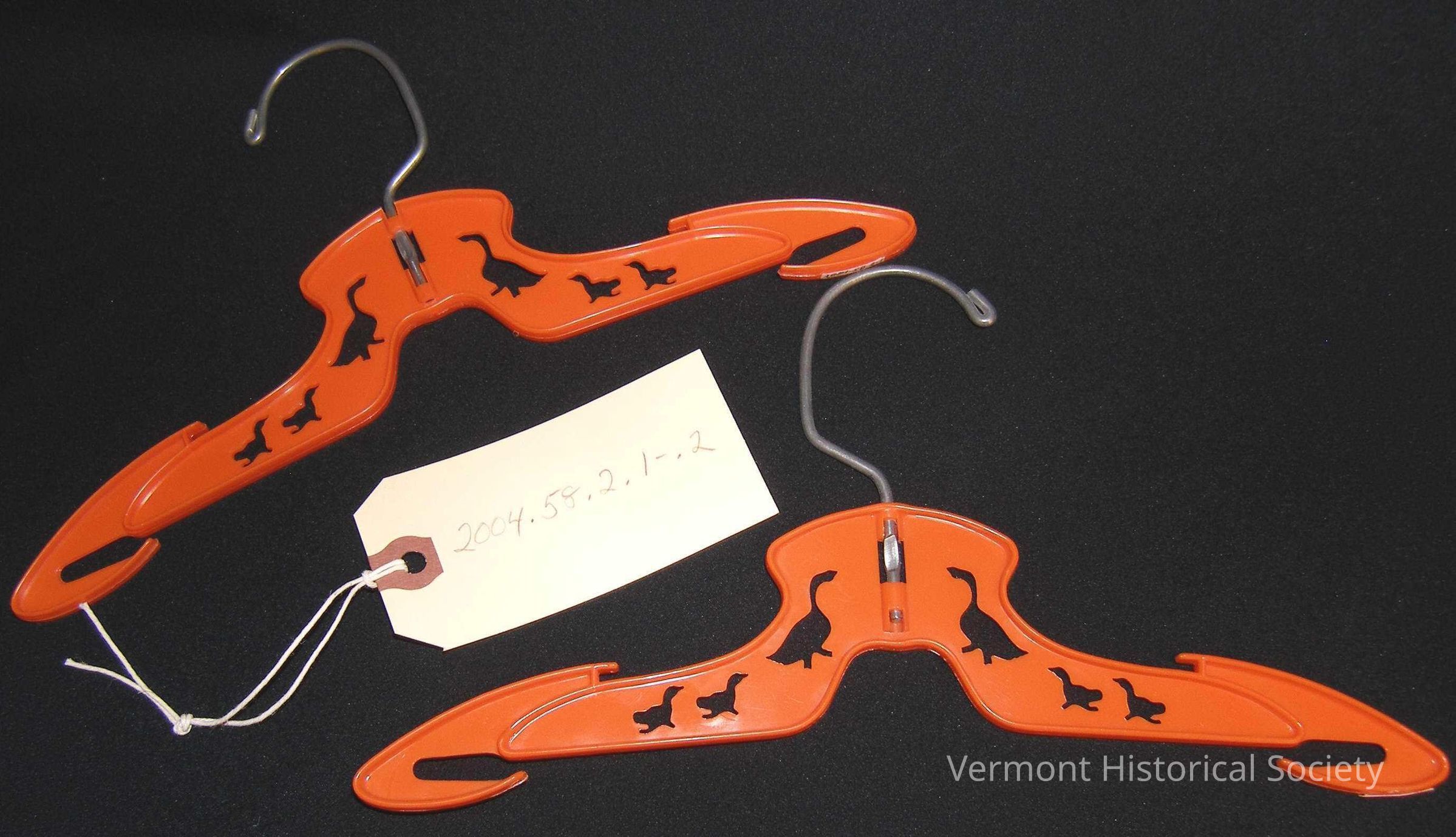Orange plastic hanger for baby clothes with goose cut-outs. It has a central metal hook for hanging.