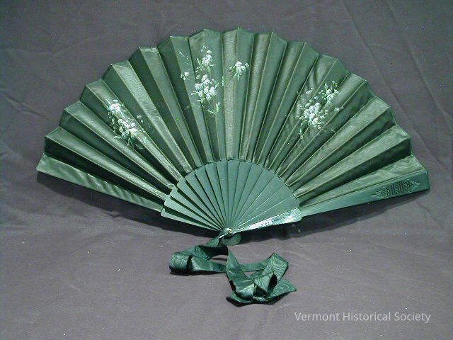 Black hand fan with silk leaf and black painted wood sticks. The leaf is painted with white flowers, and the artists name is printed near the center of the leaf: "H. Bullay".Acquisition