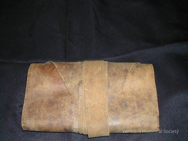 Leather account case or roll. The long strip of leather stores rolled up and unrolls to expose alphabetized slots, with each slot labeled with two letters. The roll is labeled "E White [illeg]ington" and "E [illeg]dell".