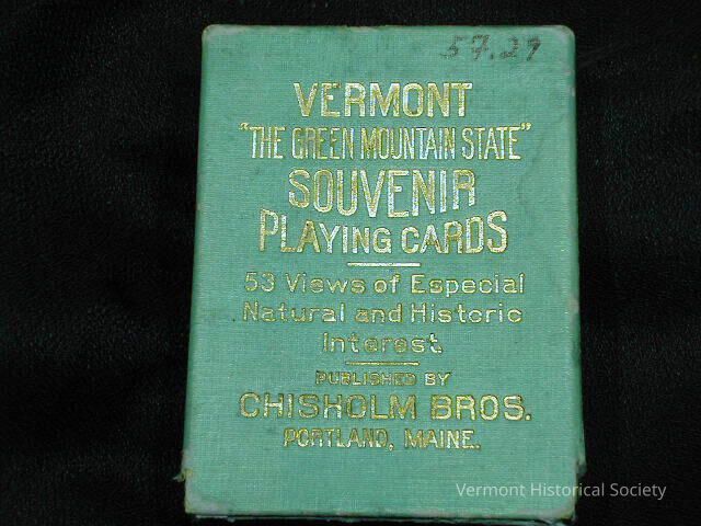Deck of 53 cards showing scenes of Vermont. The back of each card has a picture of Vermont State capital with state seal and border of state flower, the red clover. The deck is in its original green box, which has the gold label, "VERMONT "THE GREEN MOUNTAIN STATE" SOUVENIR PLAYING CARDS 53 Views of Especial Natural and Historic interest PUBLISHED BY CHISHOLM BROS. PORTLAND, MAINE."