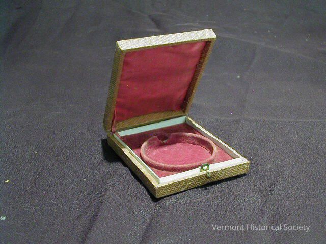 Watch case covered in shiny brown paper textured with a diamond pattern in imitation of snake skin. The inside top is lined in red silk, and the bottom has a molded insert covered in red velvet. The bottom of the box has two sticker labels placed on top of each other. The outer label reads, “F. E. Healey, Jr., JEWELER, Morrisville, Vt.Context