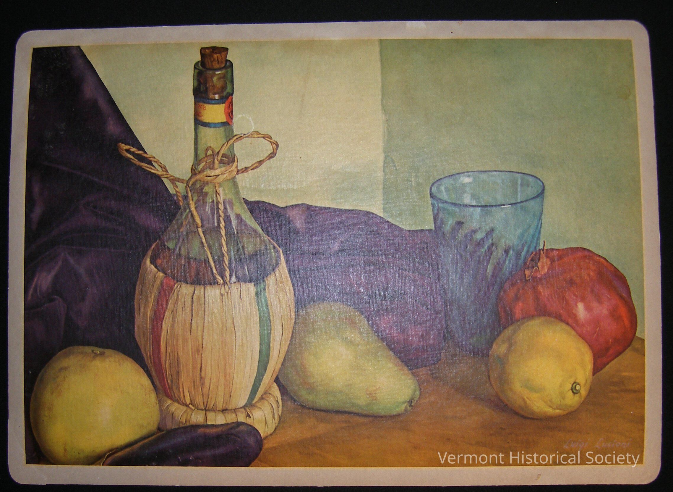 The placemat features a still life artwork by Luigi Lucioni titled "The Wine". The image depicts a wine bottle wrapped in raffia, a blue tumbler, five pieces of fruit, and a piece of deep purple velvet in the background. The back of the placemat is made of cork and there is a paper label located in the lower left corner of the back.