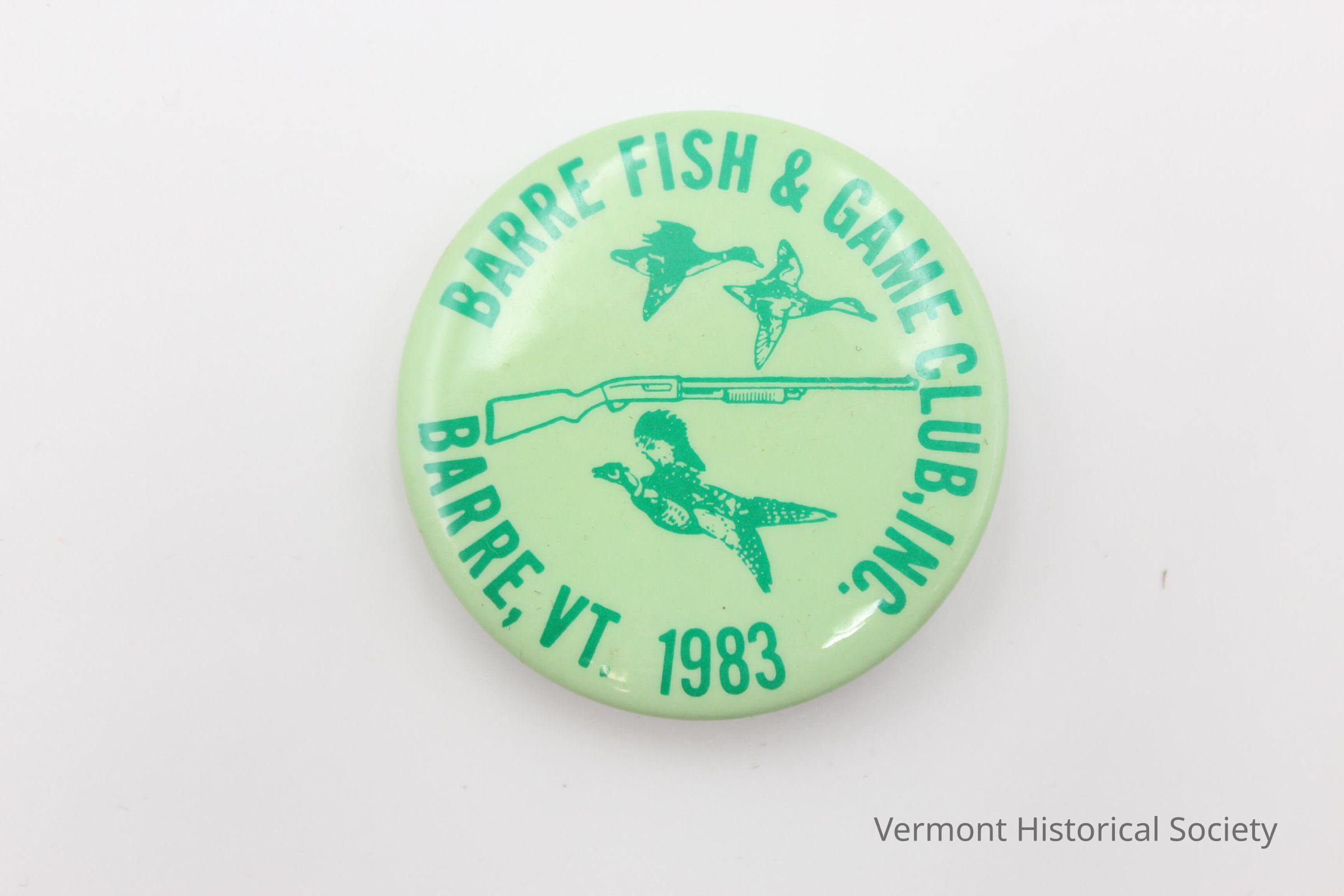 Round, light green metal button with dark green printing. The inscription "BARRE FISH & GAME CLUB, INC./BARRE, VT. 1983" circles around the edge with an illustration of three ducks in flight and a hunting rifle.