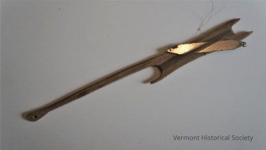 Thousands or perhaps millions of these efficient little hand carved ice fishing pole/reel combo tools were carved by everyone who could get onto the ice in the winter, whether Abenaki, French or English. We do know that an Abenaki man from Highgate Springs, Vermont used this to fish off of Shipyard Bay, “over by Bandstand Island” during the early 1900’s.Acquisition