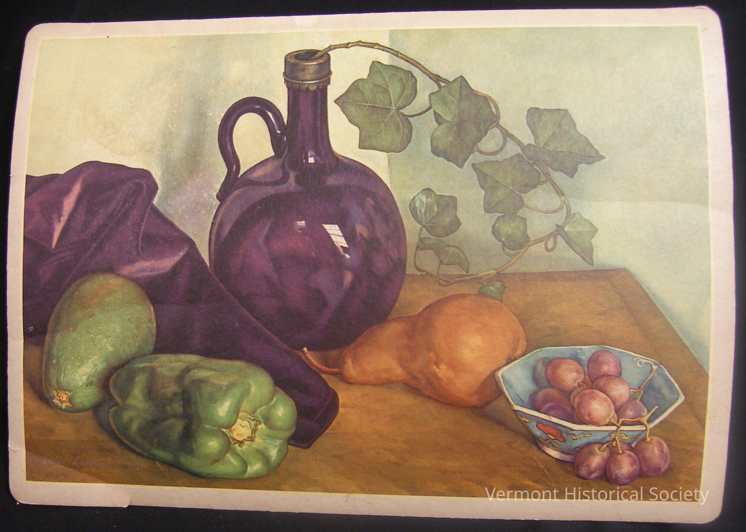 Still life placemat featuring artwork by Luigi Lucioni titled, "Fruit on Velvet." The placemat depicts a deep purple wine bottle with ivy, a small bowl of grapes, a pear, a green pepper, and another piece of fruit resting on deep purple velvet. The back of the placemat is made of cork, and there is a paper label attached to the lower left corner of the back.