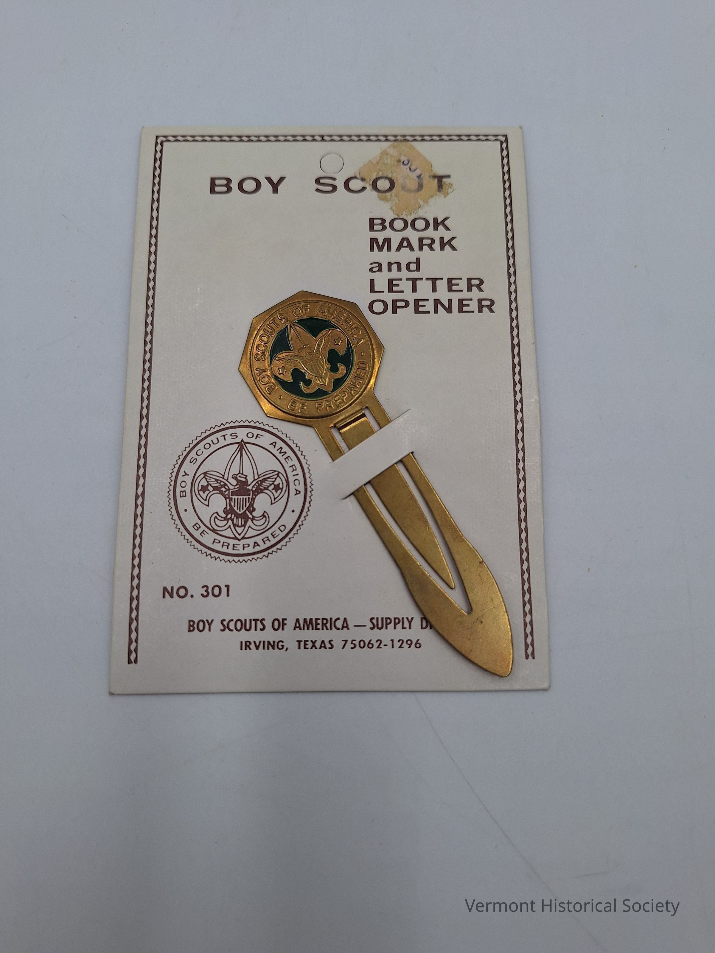 Boy Scout bookmark and letter opener. The metal opener has an octagonal handhold at the top emblazoned with a fleur de lis at the center surrounded by green enamel and the words "BOY SCOUTS OF AMERICA BE PREPARED." The opener is on a paper label from the Boy Scouts Supply Division.