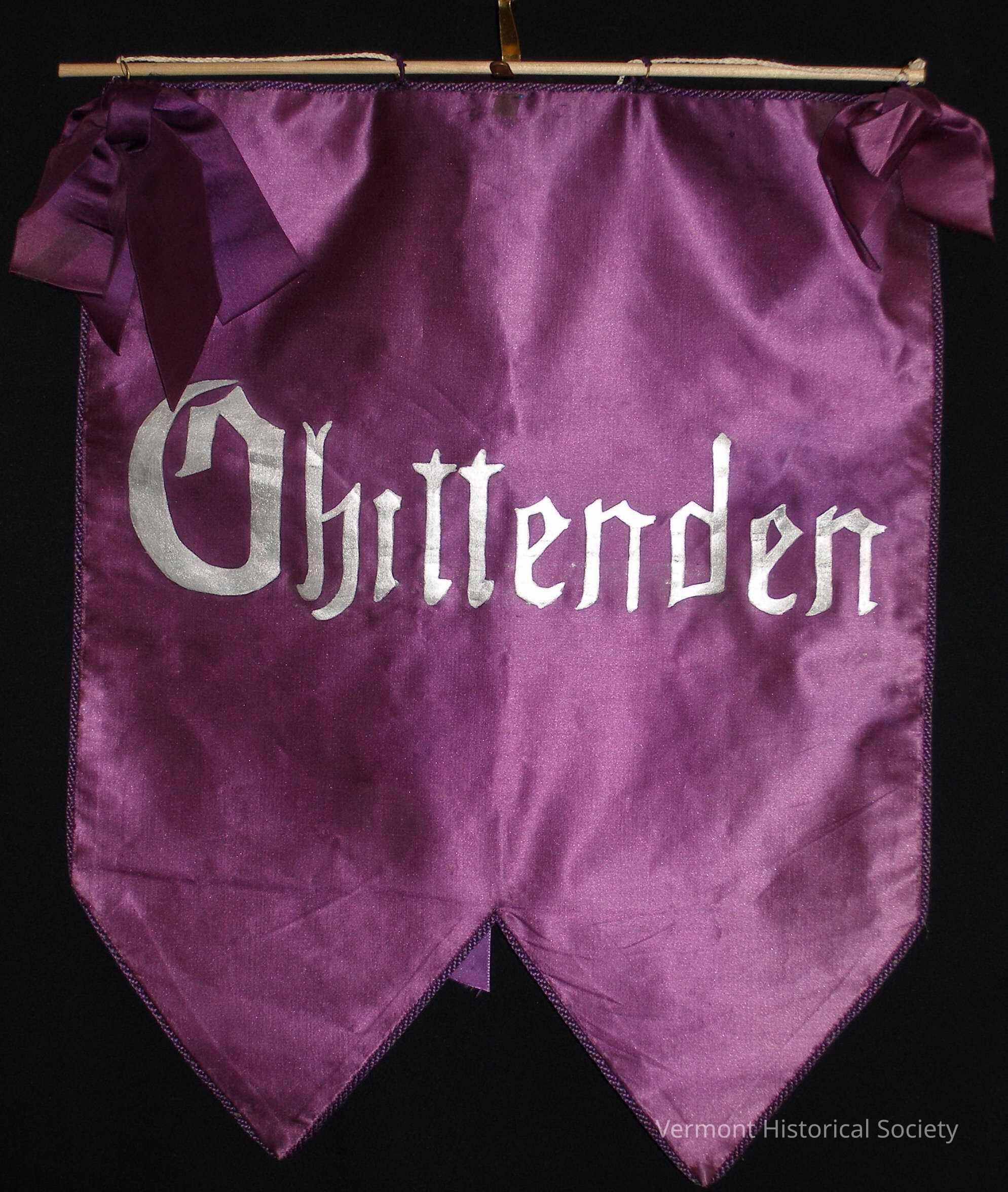 Purple satin banner. The the word "Chittenden" is painted in silver across the middle of the banner. The bottom splits into 2 points. The banner is edged all around by purple cord. The top is attached to a narrow wooden dowel. There is a white cord attached to the dowel at either end.