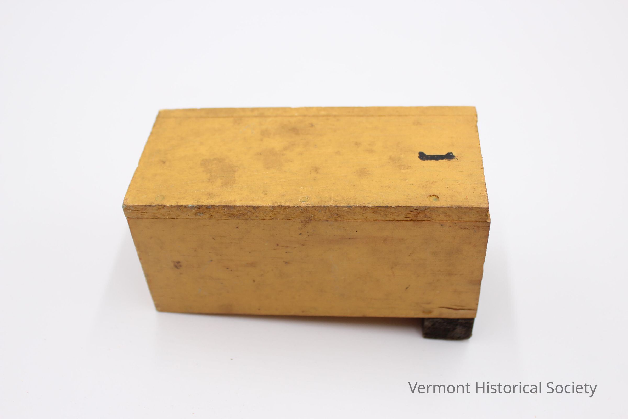 Small wooden putting hazard consisting of a rectangular box with open ends. There is a small wedge beneath one side, causing the box to sit at an angle. The box is painted yellow and there is a number 1 painted on the top.