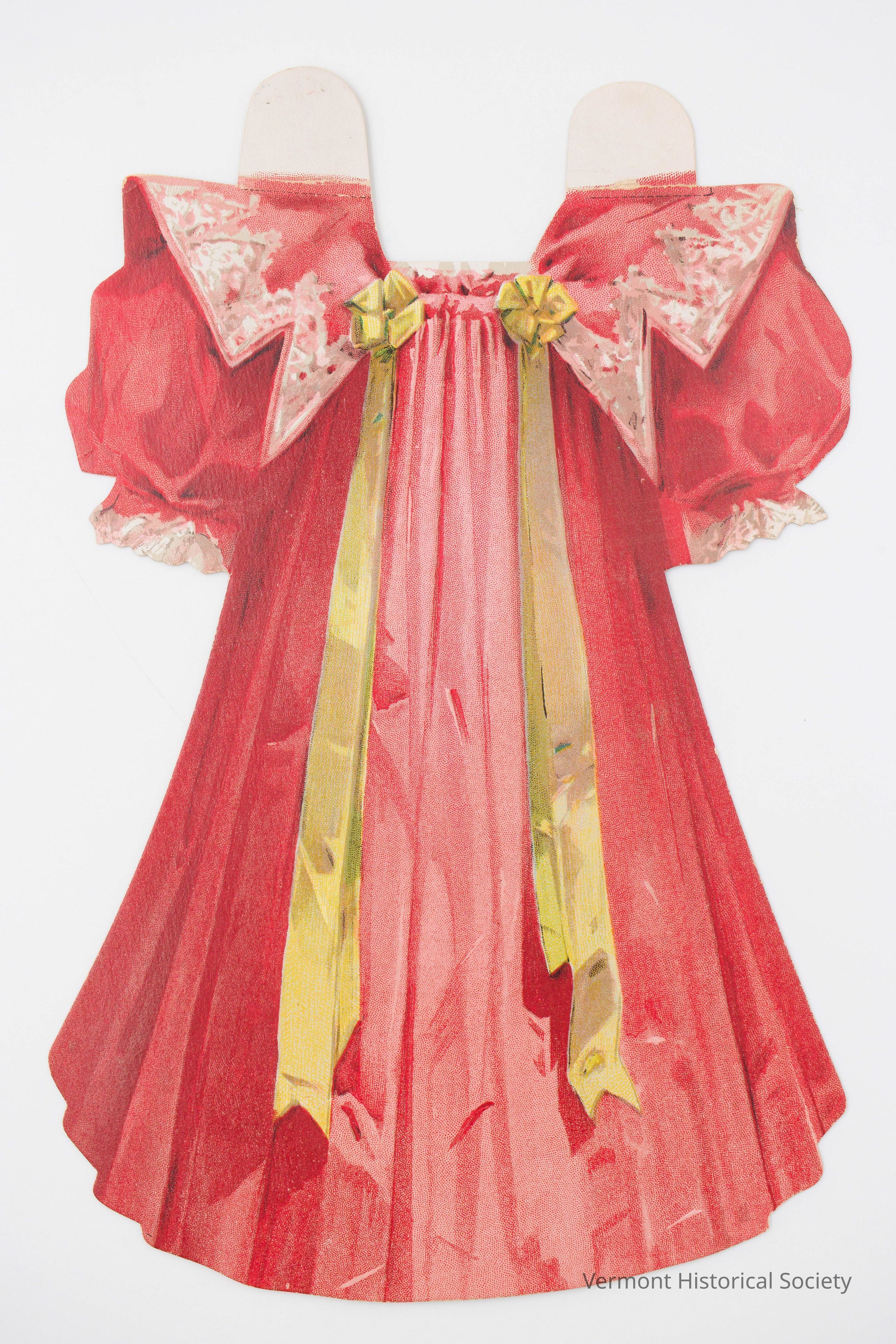Large paper doll dress. The dress is pink with 2 yellow ribbons vertically down the front. It has large, puffed sleeves and a wide collar. There are two white tabs at the shoulders.Context