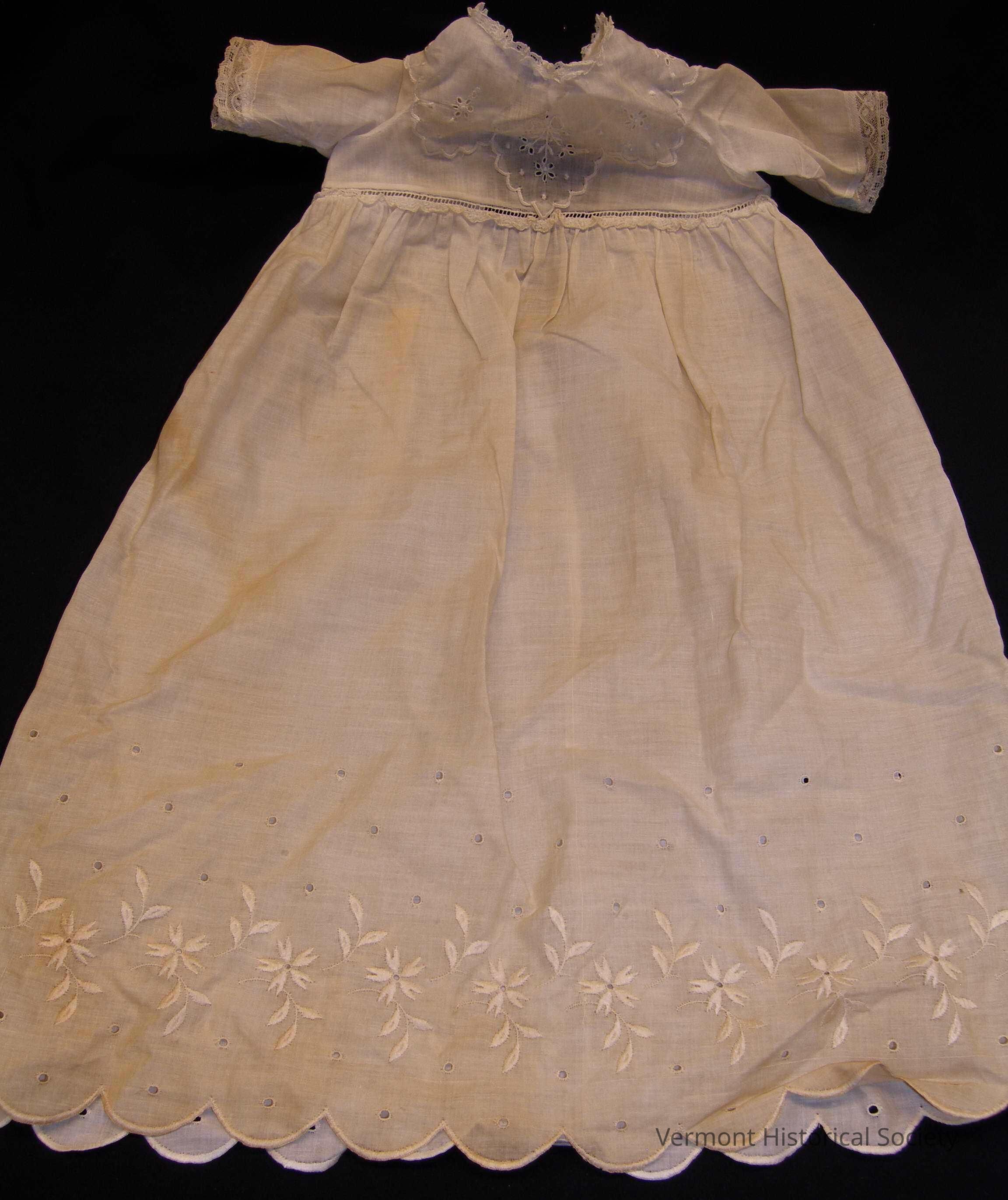 This doll dress is made from fine cotton and has short sleeves, a high waist, and a long skirt that is slightly gathered at the waistline. The bodice of the dress is decorated with eyelet embroidery. Along the scalloped hemline, there is additional whitework and eyelet embroidery. There is lace trims along neckline and sleeve edges and around the high waistline. There is an 8.5-inch opening in the back, which is fastened with 5 buttons and corresponding buttonholes.Context