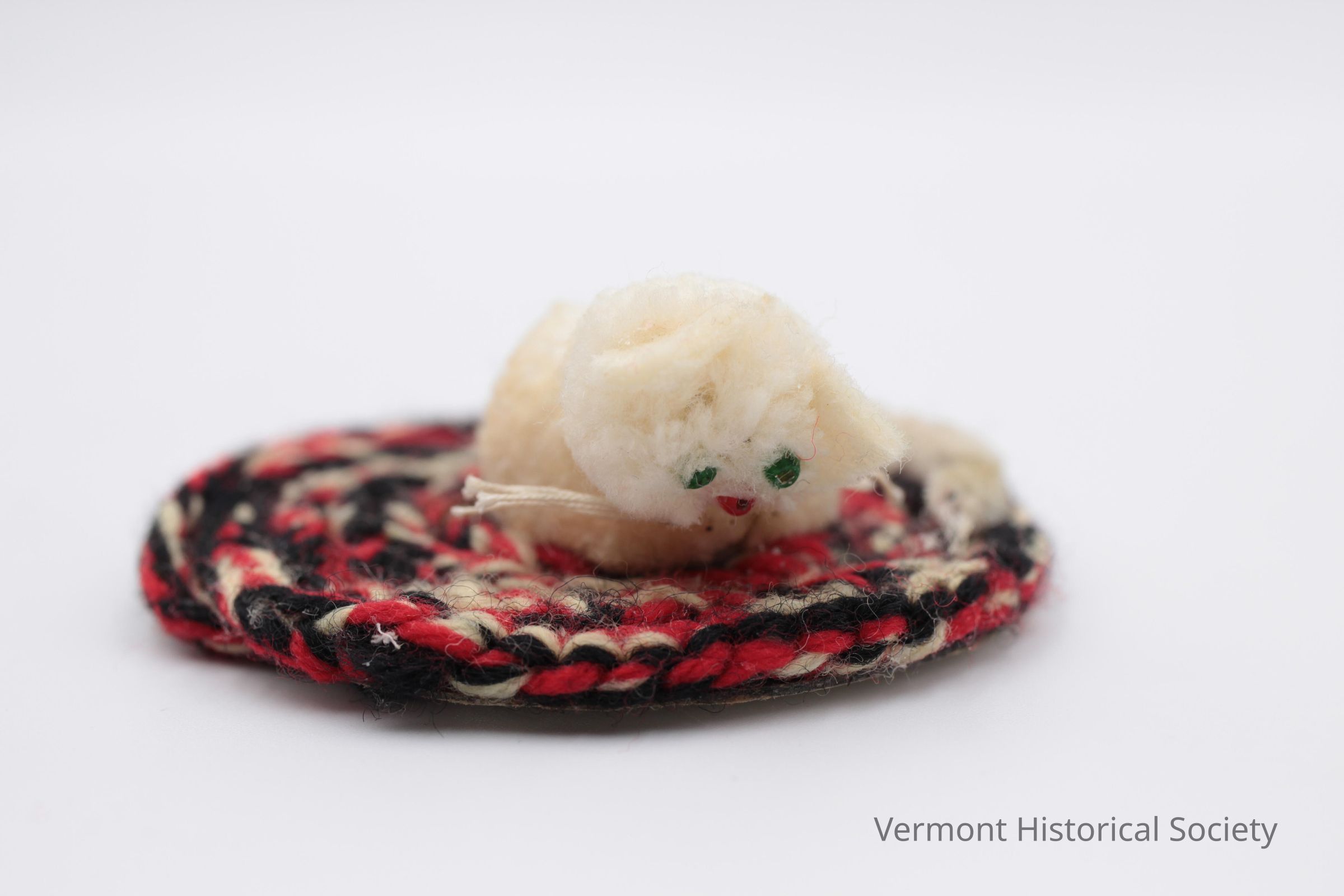 Miniature white cat on a braided rug sized for a dollhouse. The cat is formed from two pompoms with a chenille tail. Its face is represented by two green glass seed bead eyes and a red glass seed bead mouth. There are thread whiskers. The rug is formed from plaited red, white, and black yarn wound into a circle.Context