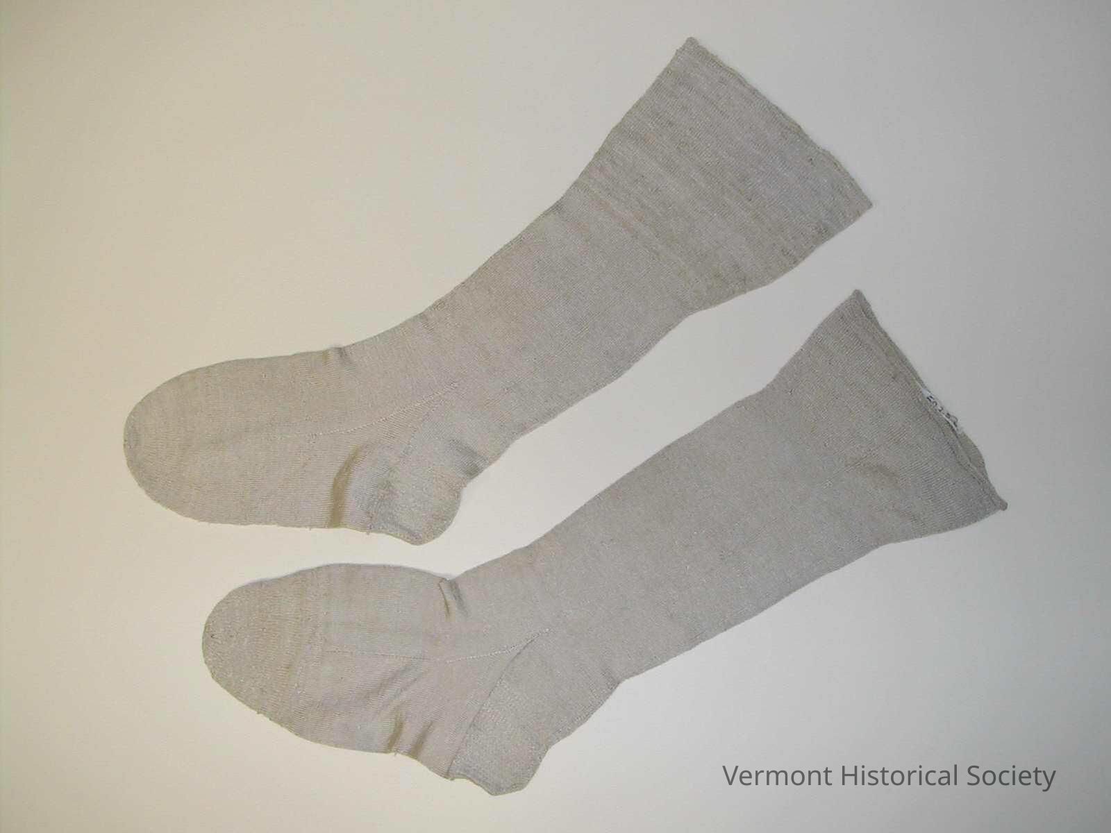 Pair of hand knitted silk stockings. The stockings each have seams along the sides of the feet and down across the sole in front of the heel. The tops of the legs flare outward slightly.