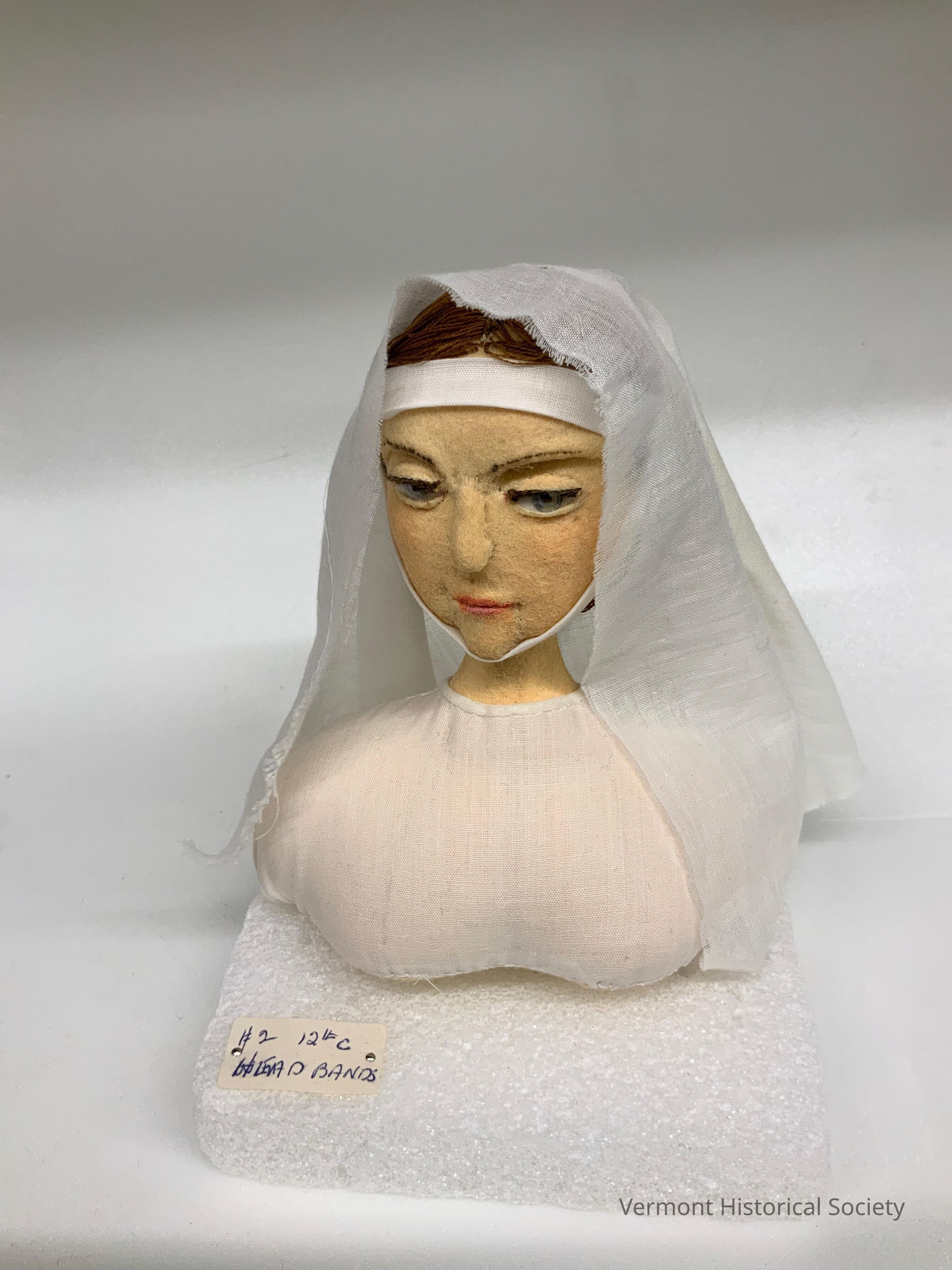 The bust is wearing a headdress consisting of a white cotton band around the upper forehead and across the bottom of the jaw. A half-circle veil of semi-sheer white cotton is draped across the head, pinned to the straps.