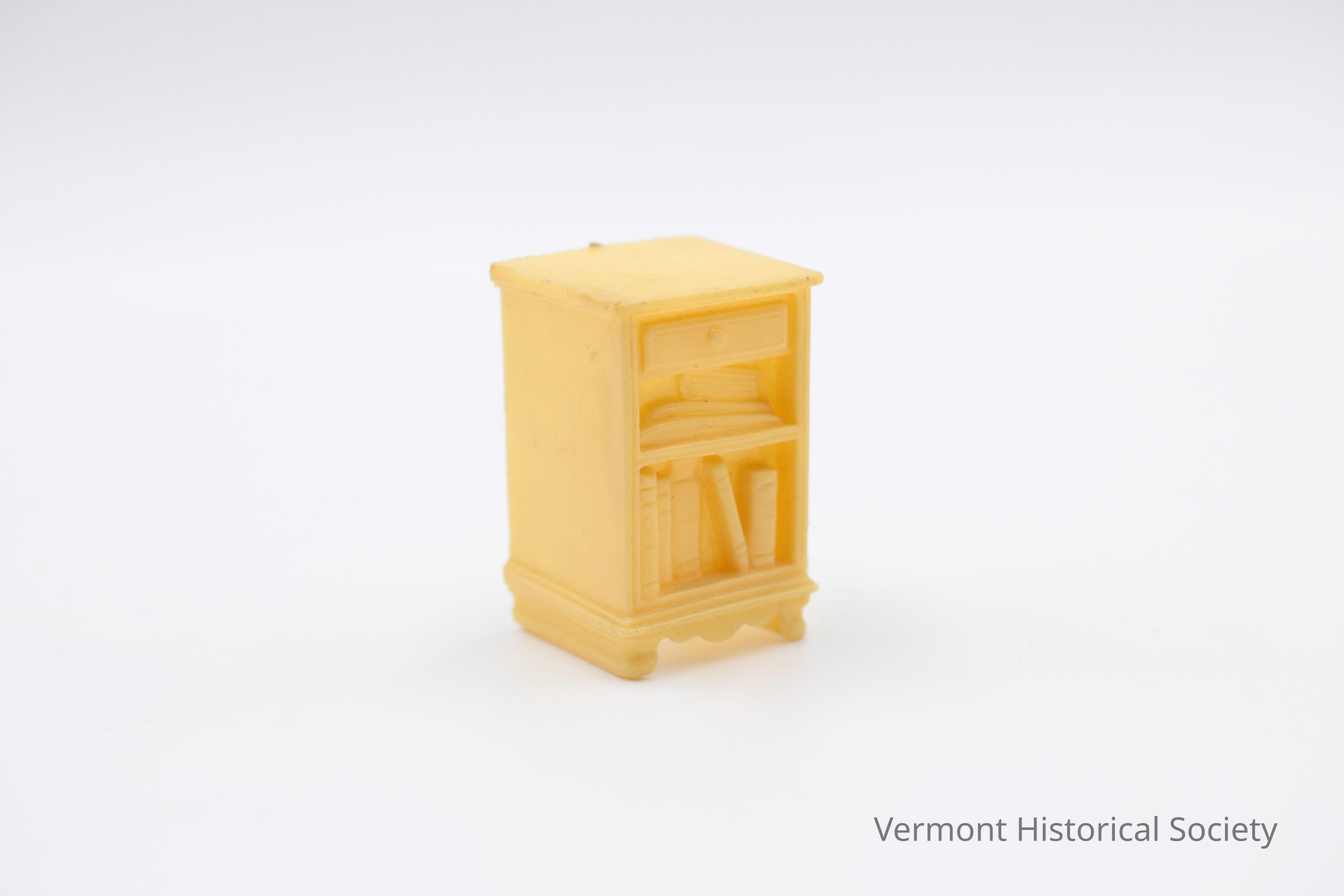 Miniature cream-colored plastic nightstand sized for a dollhouse. The front is molded with a drawer face at the top, and a shelf across the middle. Surrounding the shelf, the plastic is slightly recessed and shaped to look like the top is stacked with fabric and the bottom is filled with books.Context