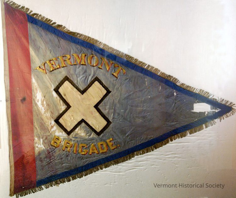 1st Vermont Brigade (the "Old Brigade") brigade guidon. Attached to staff by a sleeve. Metal fringe present. Flagstaff has halberd finial, presentation label on staff.