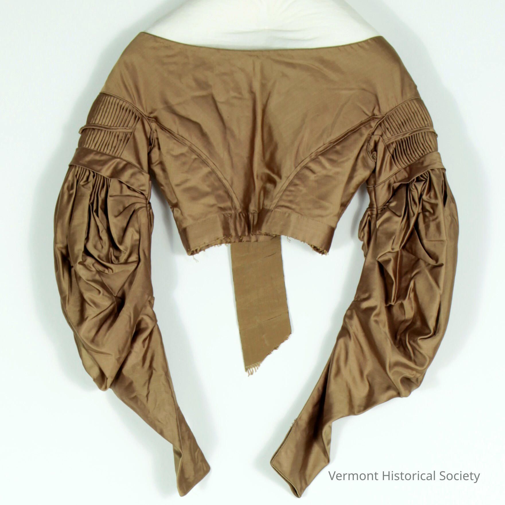 Brown silk dress with full, long sleeves and a slightly raised waist. The skirt portion has been detached from the bodice. The top of the sleeves are pleated with small knife pleats close to the wearer's arm, and the rest of the sleeve is left very loose, curving into the inner seam. The disassembled dress consists of a bodice, a skirt (waist band replaced), a capelet, and a belt.
