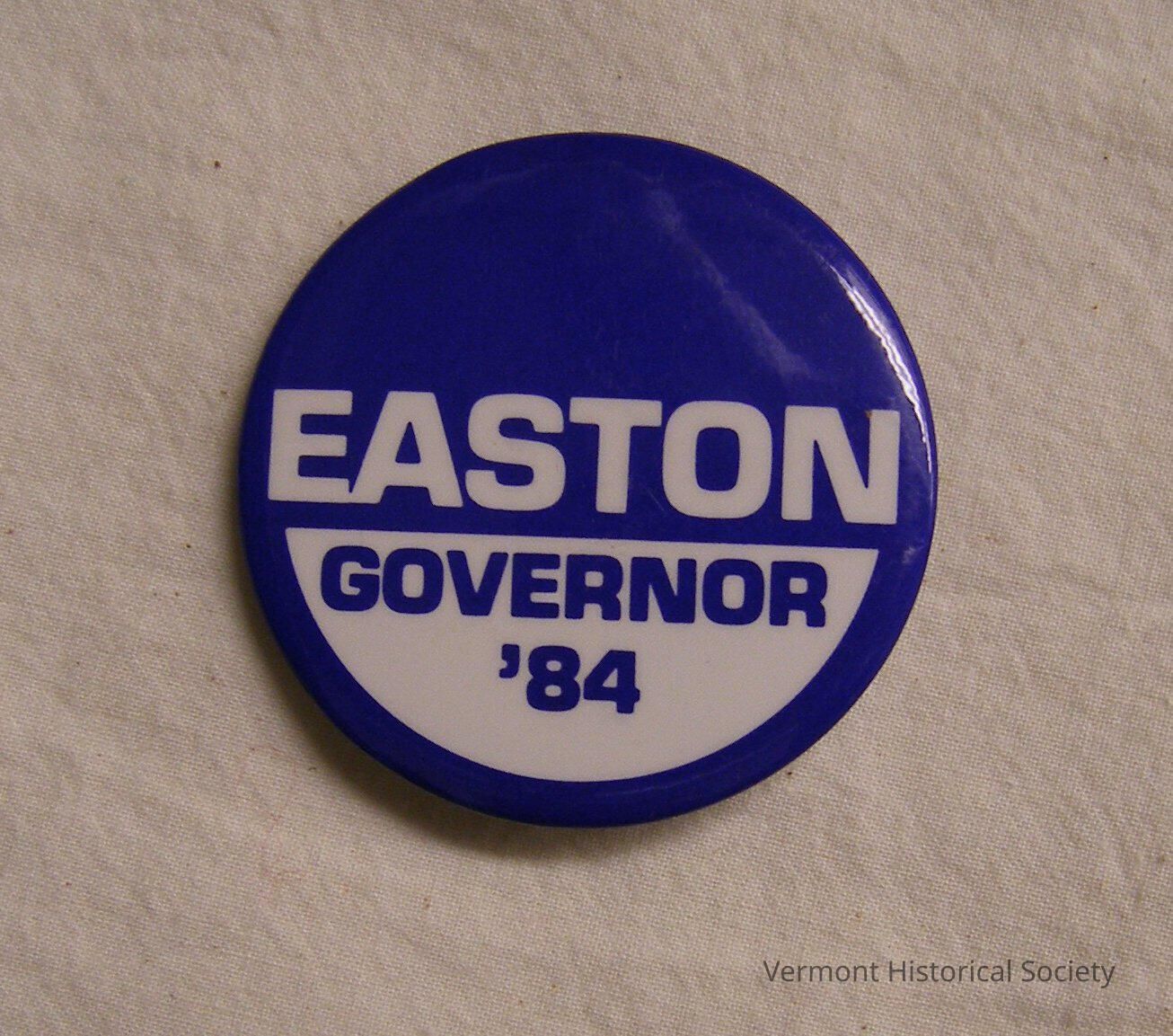 Round blue button, with a semi-circular white wedge on the lower half and the inscription, "EASTON GOVERNOR '84".
