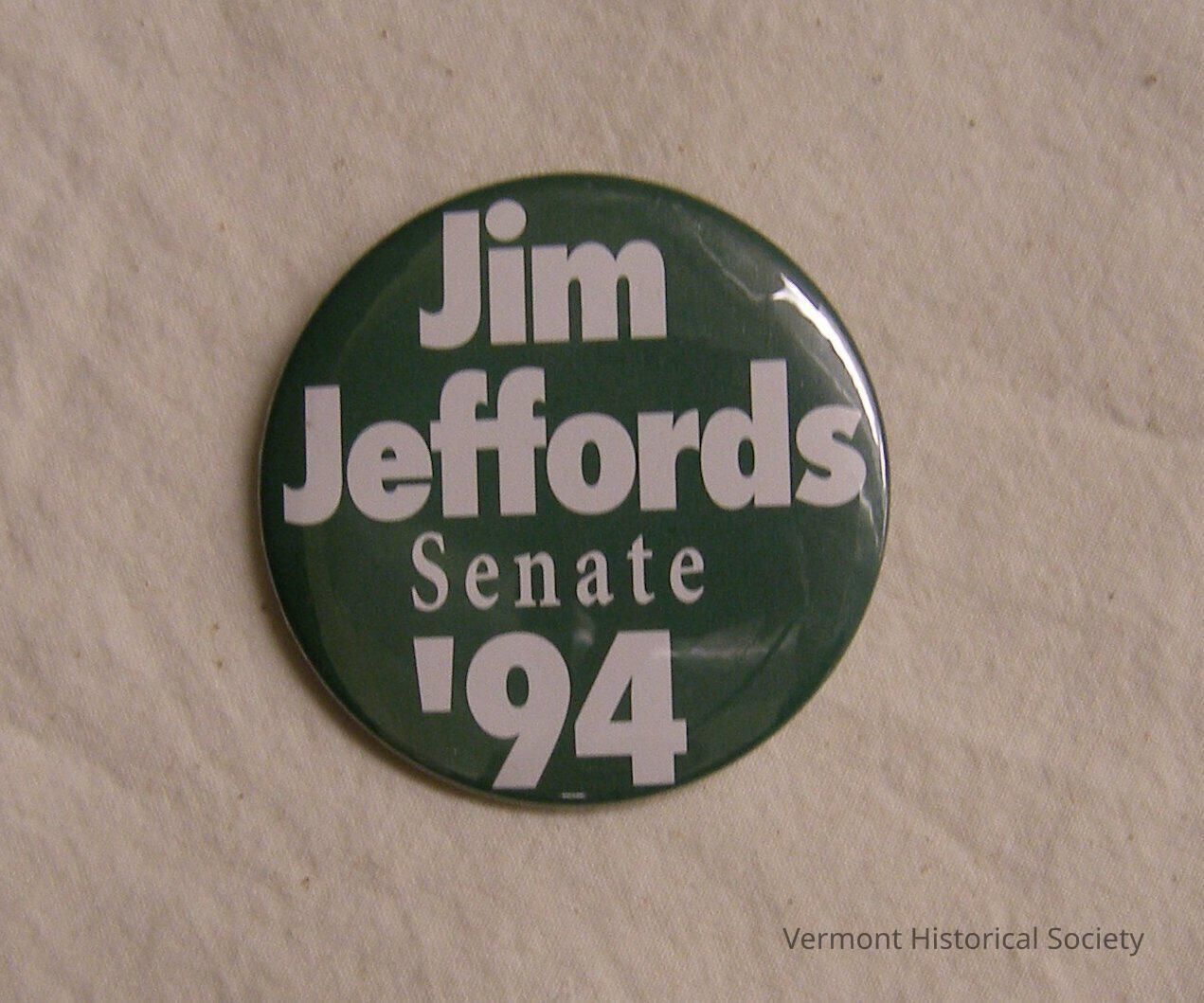 Round green button with the white sans-serif inscription, "Jim Jeffords Senate '94".
