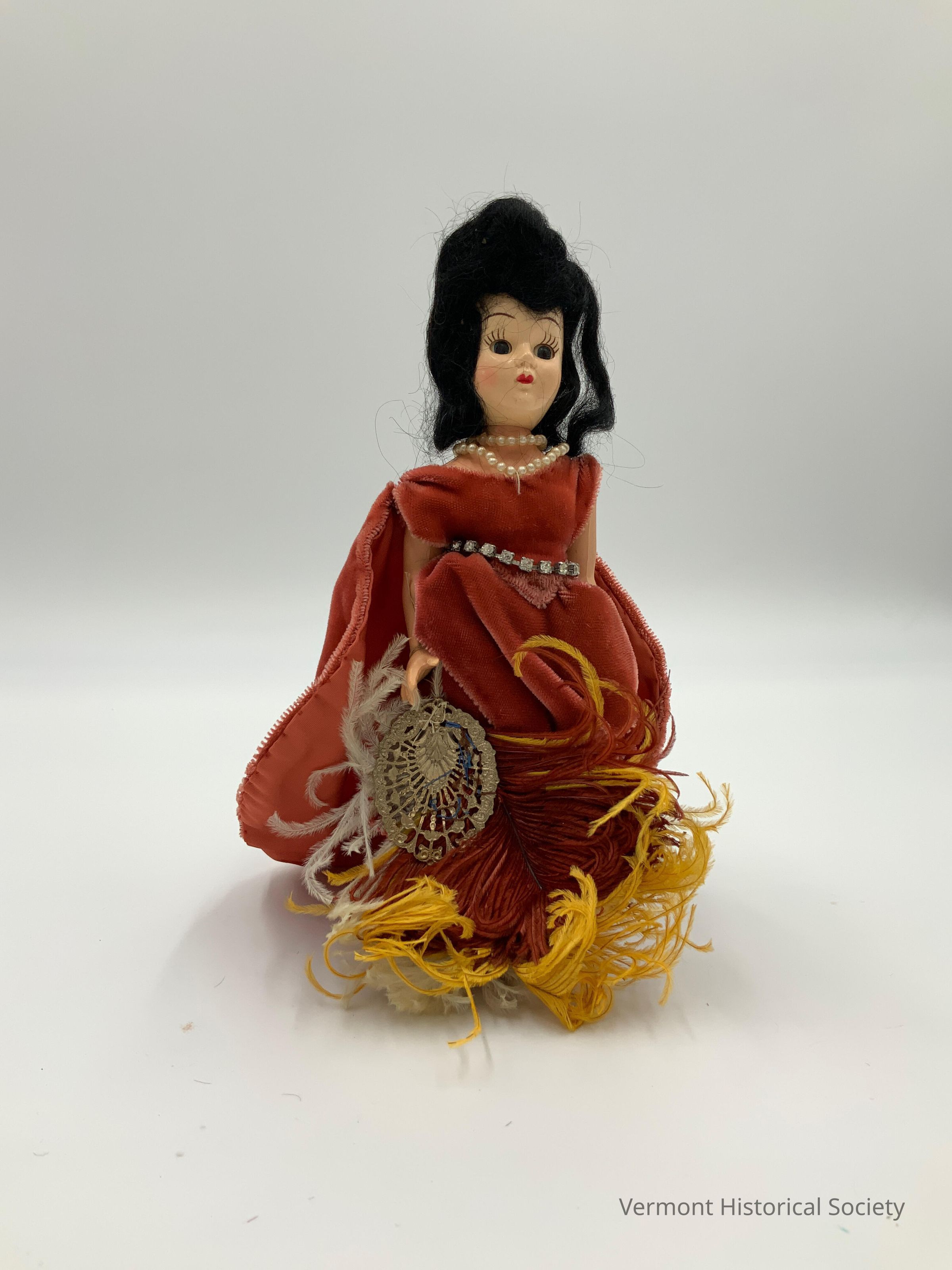 Small plastic doll wearing an ornate red velvet dress. The doll's arms and legs are hinged at the shoulders and hips, and the head swivels on the neck. The eyes close when the doll is laid prone, and open when upright, and the facial features--including eyelashes--are painted on. The hair is black and has fallen out of the original style. The dress has several tiered layers in the skirt and a Watteau train at the back. A string of crystals is around the waist, and the doll is wearing two strands of pearls around its neck. There is a stamped metal filigree fan attached to the proper right side of the doll with large red, yellow, and white feathers attached to it. The feet are molded into white shoes with a low heel.Context