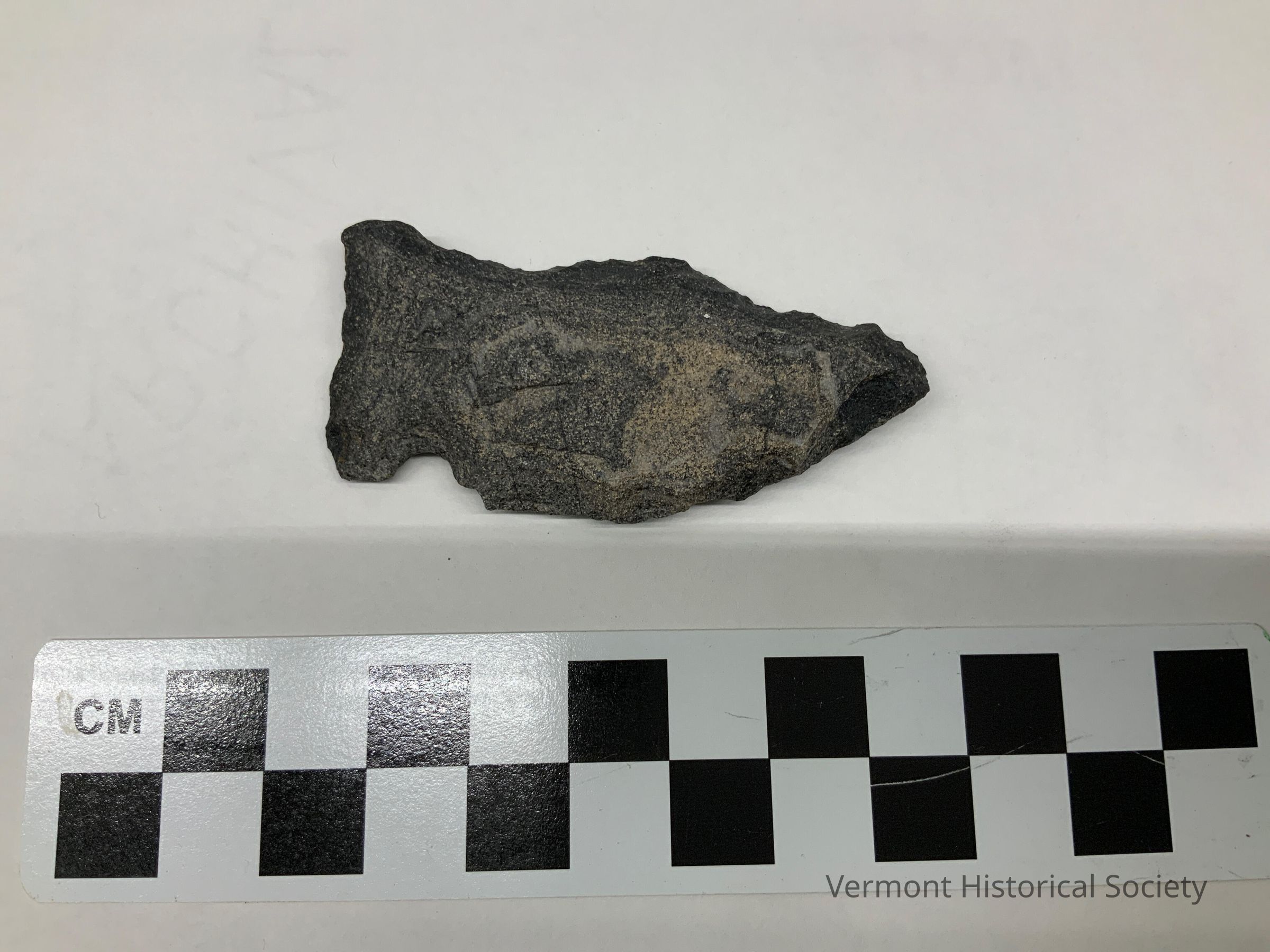 Black chipped stone projectile point with corner notches. The notch is present on one side, and one away on the other side. The lady is asymmetrical with one regular lead edge and one very excurvate blade edge.Context