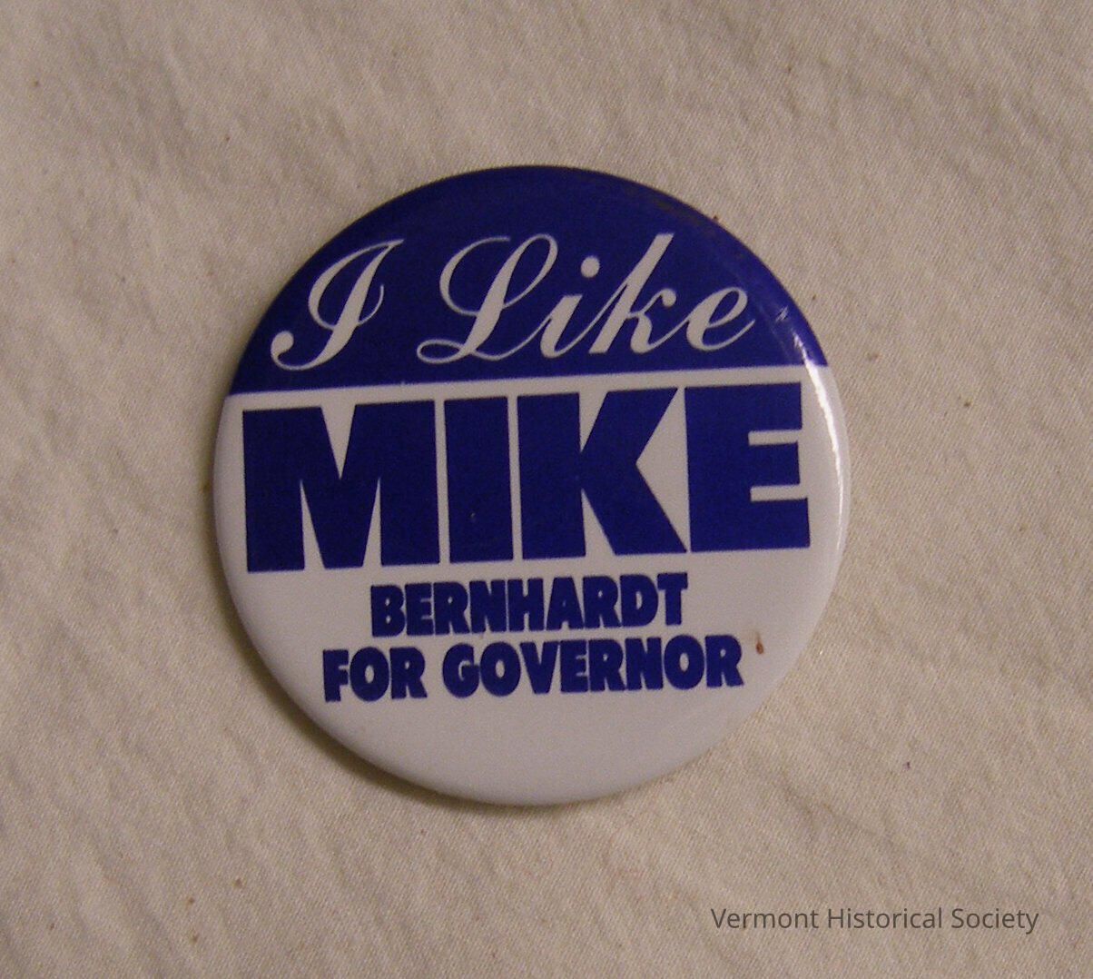 Round blue and white button with the inscription, "I Like MIKE BERNHARDT FOR GOVERNOR". In tiny letters along edge is the inscription, "Versitile Graphics Burlington, VT 862-3762"
