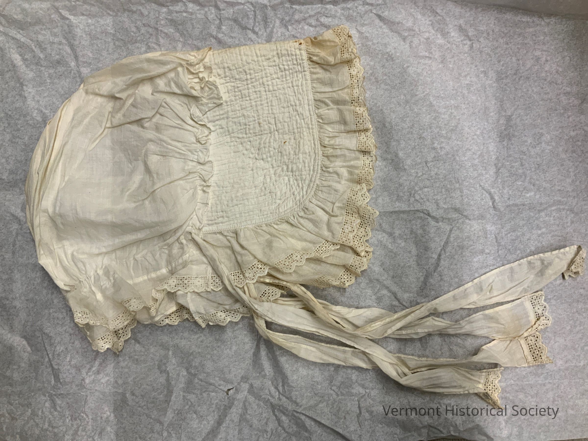 White cotton cap with a wide stiffened brim. The brim and neck are trimmed with white cotton edged in narrow lace. There are 4 ties for securing the cap to the wearer's head.Context