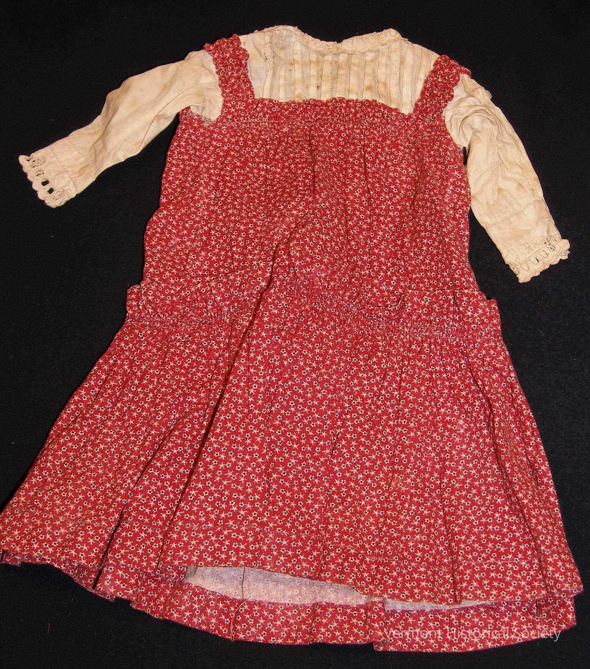 Doll dress. It is a single piece made to look like a jumper worn over a blouse. The jumper is red calico printed a pattern of with small white flowers. The skirt is tiered with a wide ruffle. The false blouse has vertical tucks at the front, and long sleeves trimmed with lace cuffs. The dress opens along the center back and secures with 2 buttons.Context