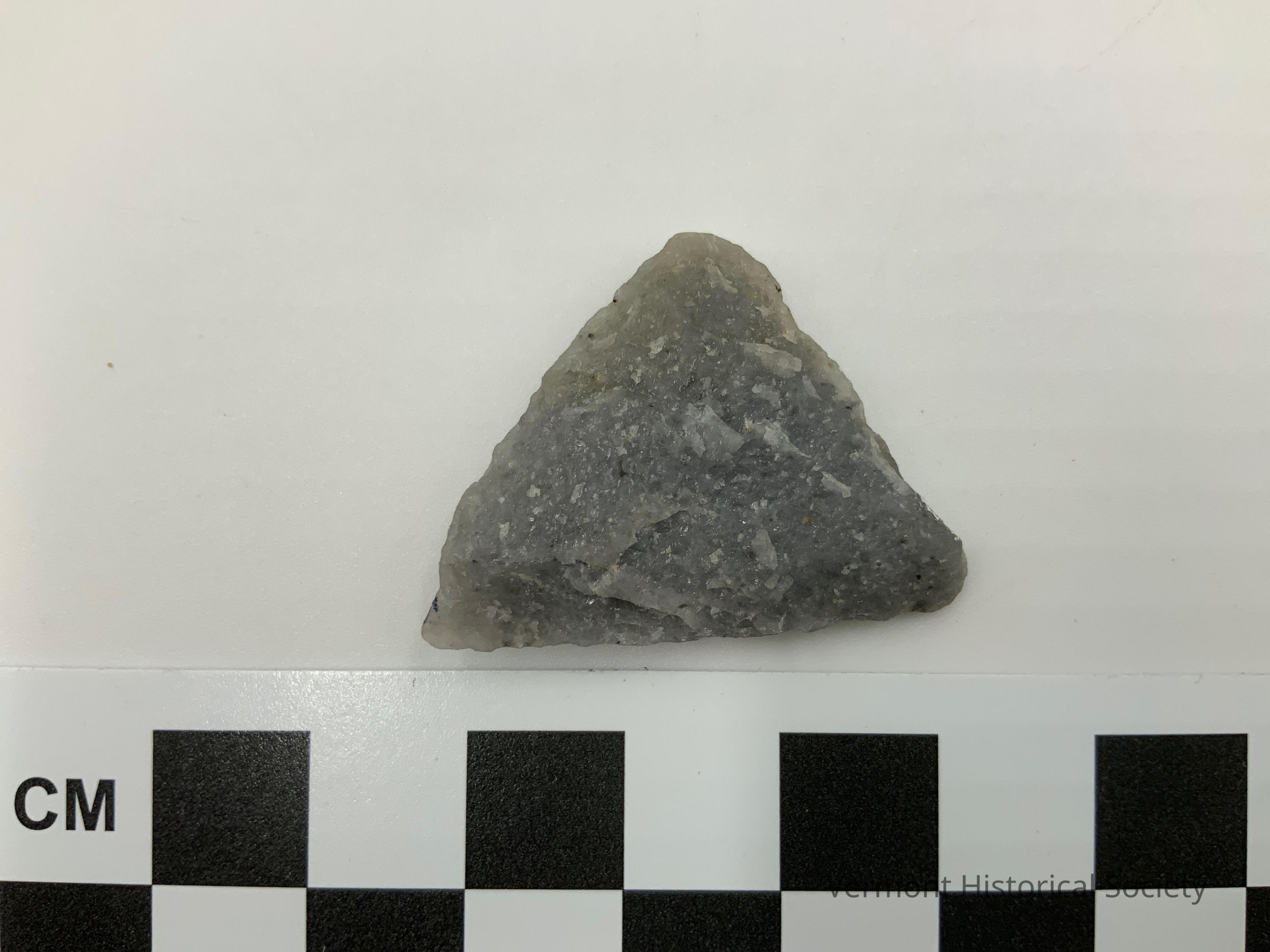 Triangular grey chipped stone projectile.