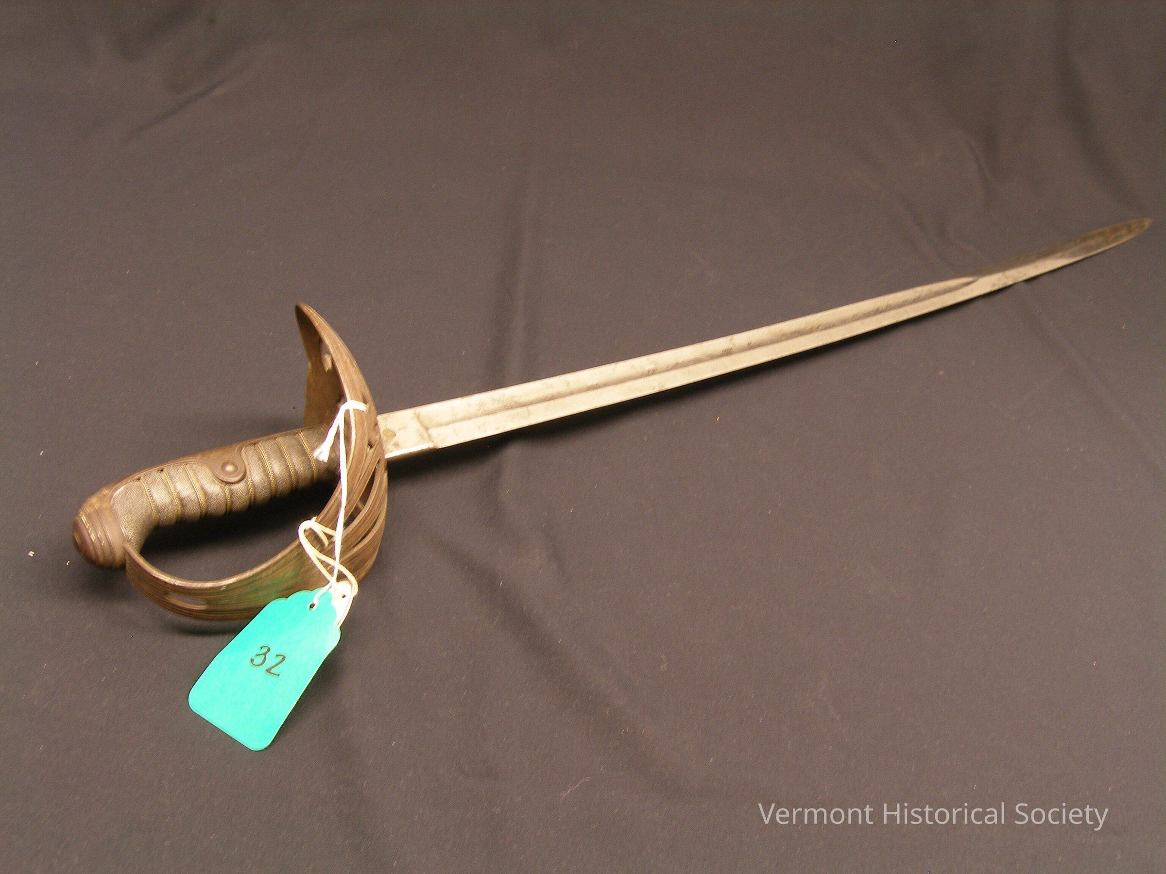 Saber with scabbard. The grip is shagreen accented with twisted wire. The guard is formed of a single piece of bronze decoratively cut to look like multiple straps. The blade is marked, "Clauberg Solingen" with a small engraving of a person in full metal armor.