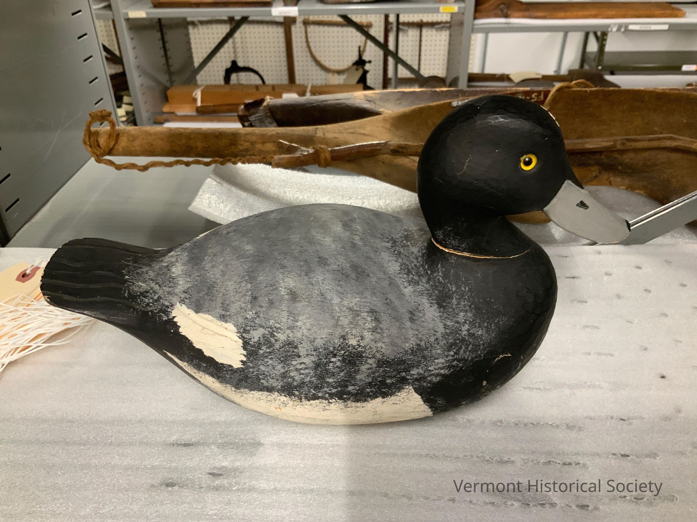 Wooden decoy. The decoy’s head is a solid black color except for a gray beak and yellow eyes. The neck has a slit of exposed natural wood. The decoy has a scratchy and textured layering of black, gray and white paint across the back and sides. The tail has flowing lines engraved horizontally across the surface and is covered with black paint. The words “Blue Bilt” are written in penciled cursive script on a white painted section.Context