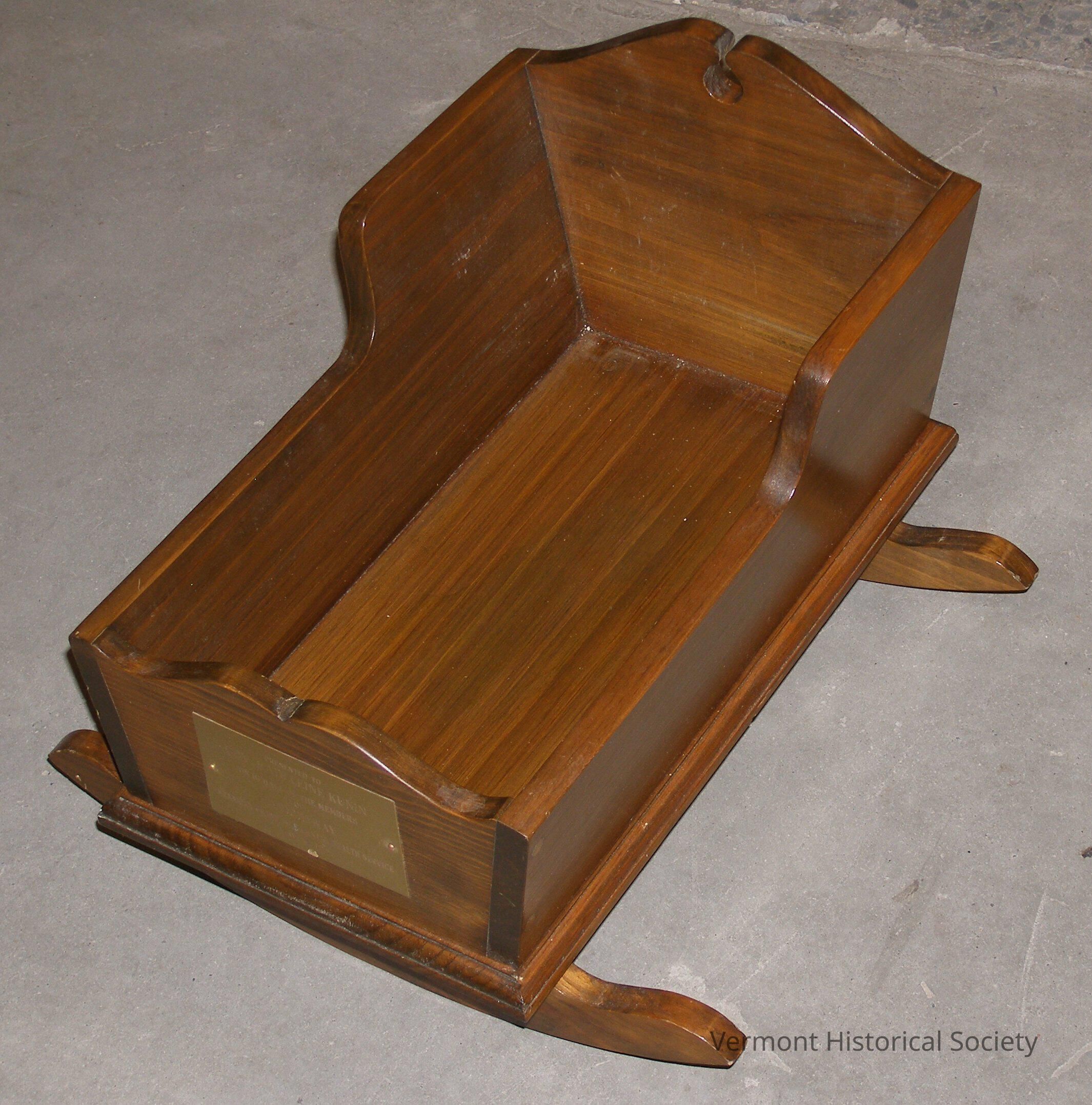 This is a wooden planter in the shape of a cradle, complete with rockers, and featuring a copper liner. Attached to the end of the planter is a brass plaque that reads: "Presented to Gov. Madeleine Kunin on behalf of the members of WRIGHTWAY Franklin Grand Isle Mental Health Service Nov. 4, 1987". The cradle planter was given to Governor Madeleine Kunin by the members of WRIGHTWAY, the Franklin Grand Isle Mental Health Service on November 4, 1987.Context