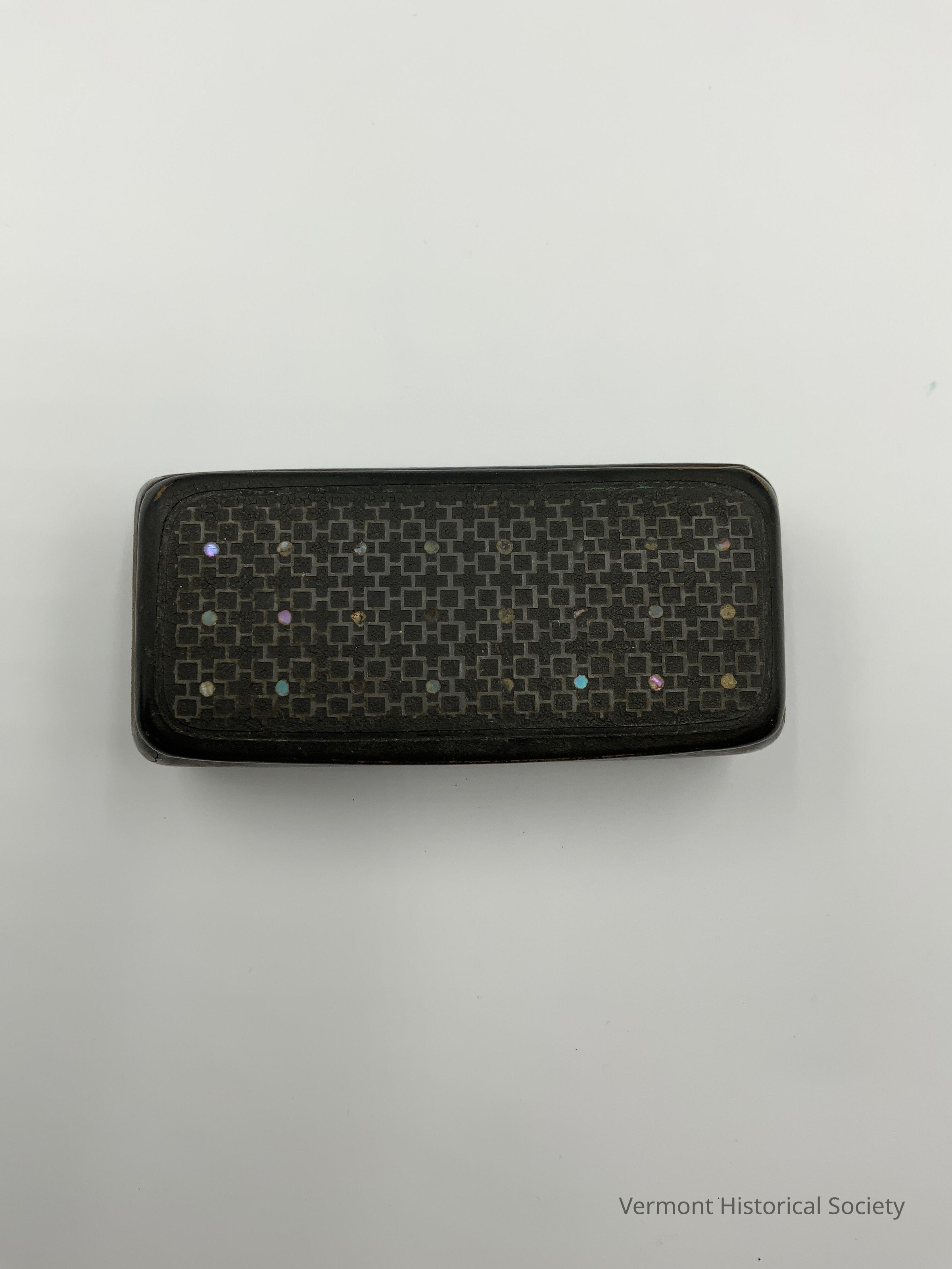 Rectangular snuffbox decorated with a raised geometric design with mother-of-pearl inlaid dots.