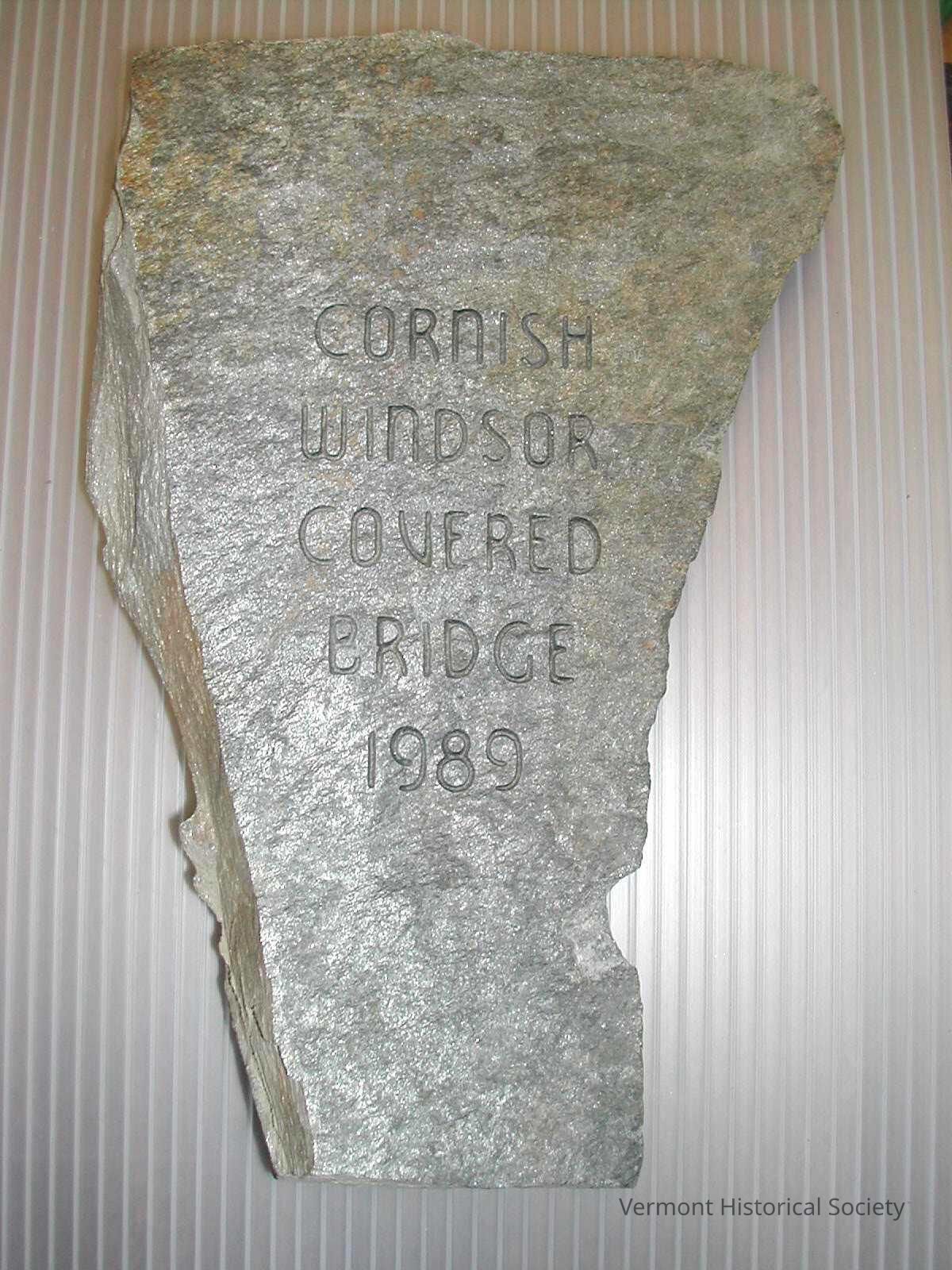 Soapstone in the shape of Vermont. One side is carved with the words, "CORNISH WINDSOR COVERED BRIDGE 1989".