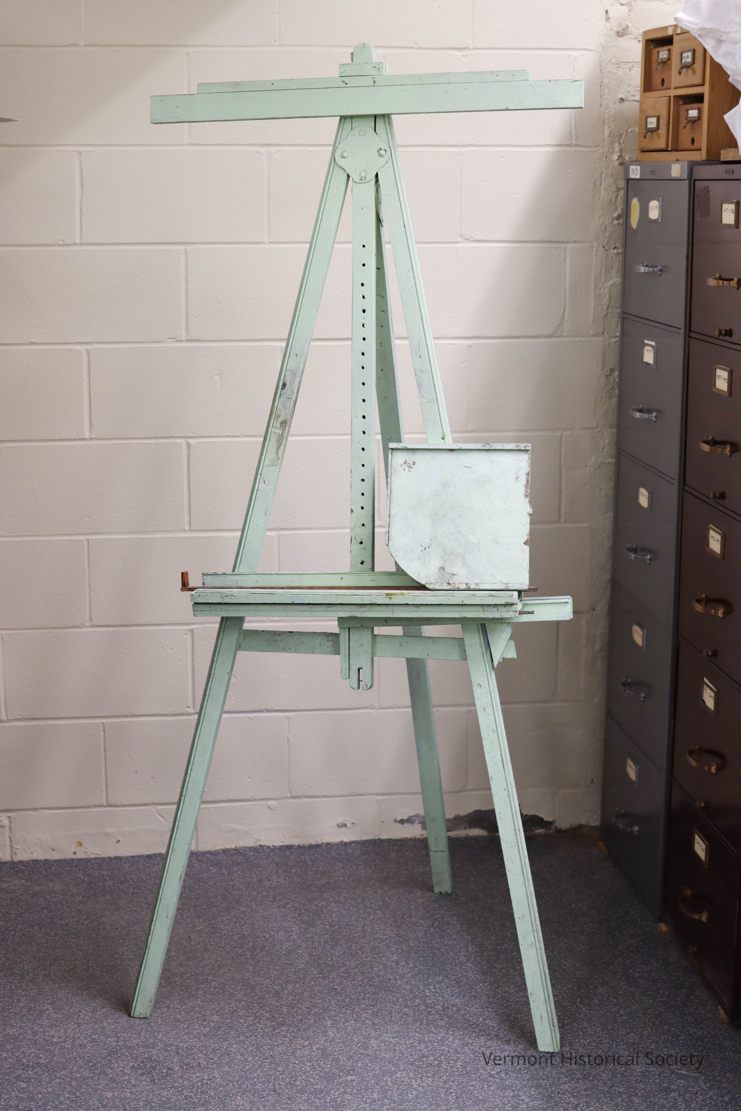 Green-painted painter's easel. The easel consists of 3 support legs, with horizontal bars between the front 2 at the top and the midway point. There is a square piece of wood with a bolt attached to the back that can be attached to the easel to hold a pallet.Context