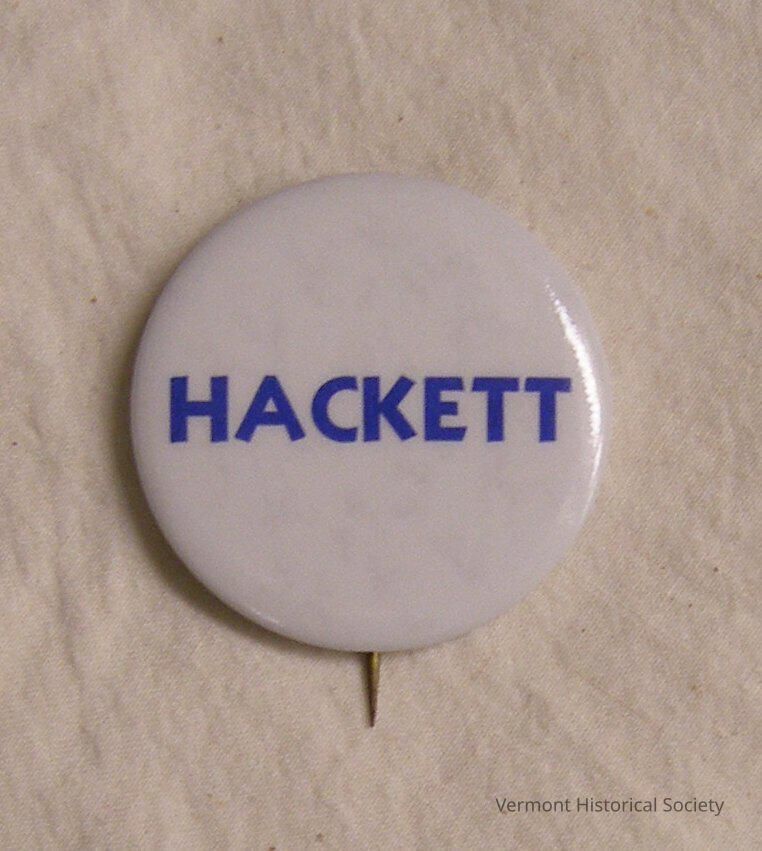 Round white button with the blue inscription, "HACKETT", across the center. The maker's name is tucked under the edge: "RUSSELL BADGE MFG WAKEFIELD MASS".